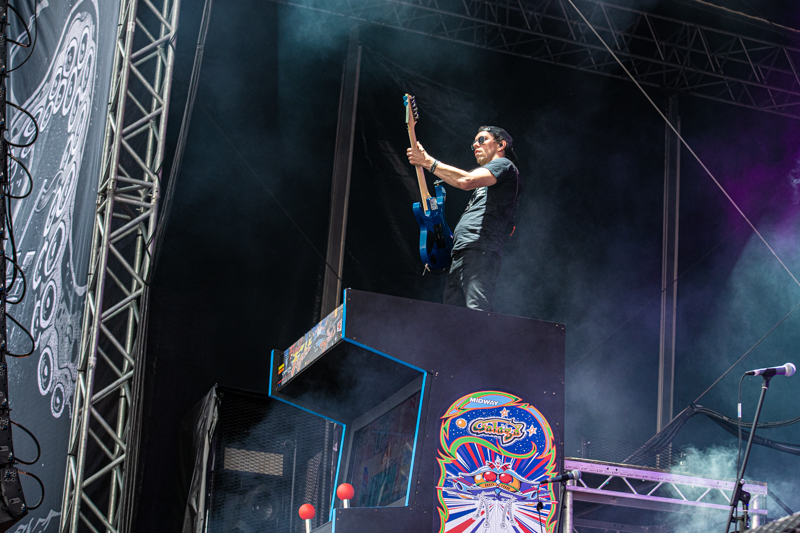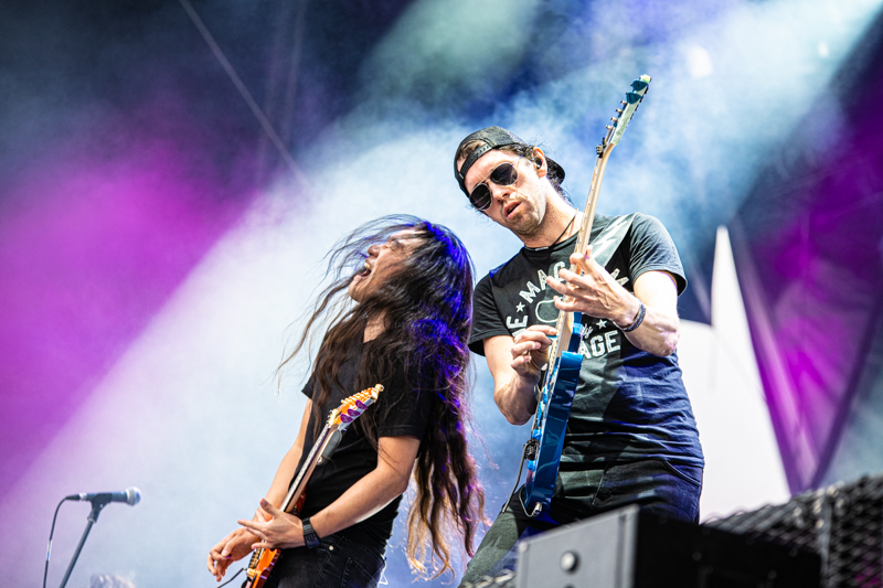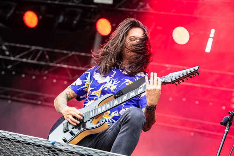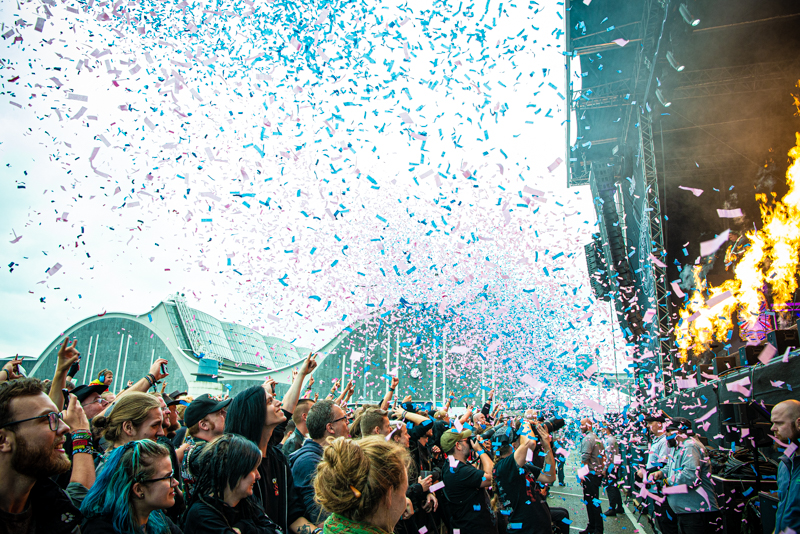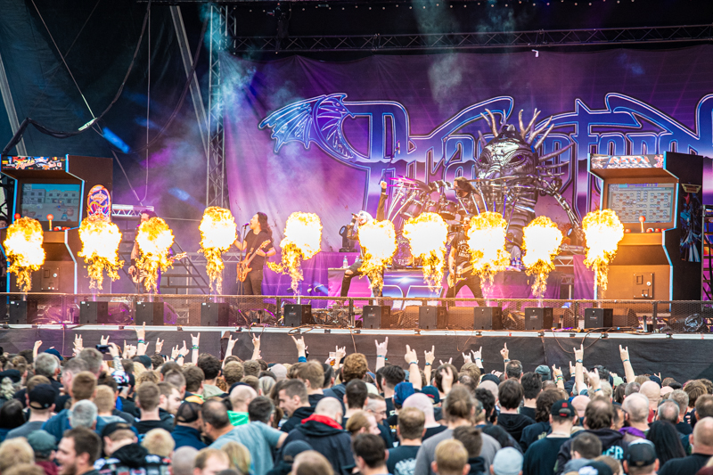 After a 30 minutes stage reset Dragonforce brings another Metal genre to the table. The band can count on a huge fanbase in Germany and Hamburg many of them visit Elbriot and are right in front of the stage. Band and fans started a Metal party, which was the first real highlight of the day. Even before the band enters the stage the scenery promises something different than what fans could experience so far. Two huge gaming machines frame the Elbriot stage with Dragonforce guitarists Herman Li and Sam Totman firing some first riff into the crowd from right there. Fast and furious Heavy Metal is what the London-based band delivers, supported by a colourful shows that includes with fire, smoke and confetti all fans can ask for. What makes the show very special too is a he fact of longtime band member Frédéric Leclercq disembarking. The gig at Elbriot is his final show with Dragonforce, a fabulous goodbye party for the bassist.