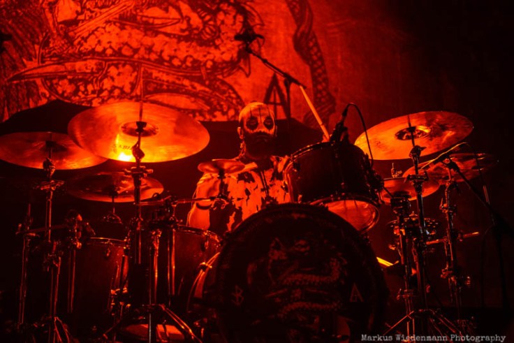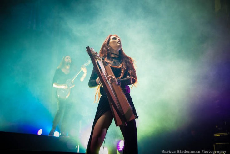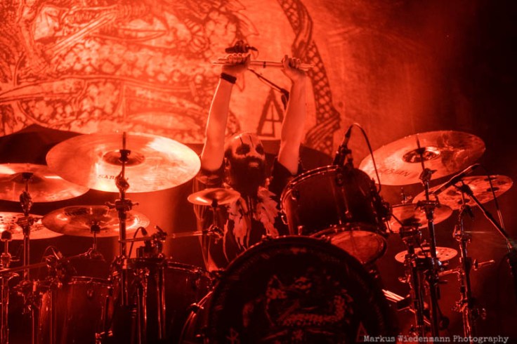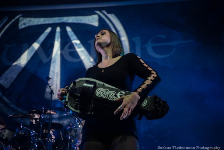 As it gets fuller in the room and it gets fuller on stage too. Already during the stage rebuilt half of the podium is covered by a big grey curtain. The moment the light goes out it’s the projection of the Eluveitie symbol that enlights the curtain while three white dressed girls introduces the band. It’s a strong visual start of a show that is very agile and dynamic. With nine musicians on stage Evuleitie has a lot of firepower when it comes to density and sound, both being strong elements in the Ronda room tonight. Of course it is the new ‘Ategnatos’ album being the centerpiece of the show with the title track leading off a 90 minutes set. In front of euphoric fans Eluveitie can also win over fans that came for Lacuna Coil. Some first crowdsurfing starts quite early in the show and there is quite some movement in the crowd too, including a smaller pit. Hard-hitting Folk Metal songs are equally welcomed as calmer moment of which Fabienne Erni touching performance of ‘Artio’ is one of. Eluveitie is very much about music and the moments of bandleader Chrigel Glanzmann talking to the crowd are limited. The positive effect though is a great vibe in the room that was only cooled down during the drum solo. Let’s take this as a moment to to take a deep breath before Eluveitie fans have with ‘Havoc’ a next chance to swing their inflatable battle axes. The nine-piece band from Switzerland is one of the leaders in Folk Metal and they underlined it tonight with a strong performance. ‘Inis Mona’ and the following outro releases metalheads releases into the crispy night in Utrecht, being satisfied with what they could witness during the previous four hours.