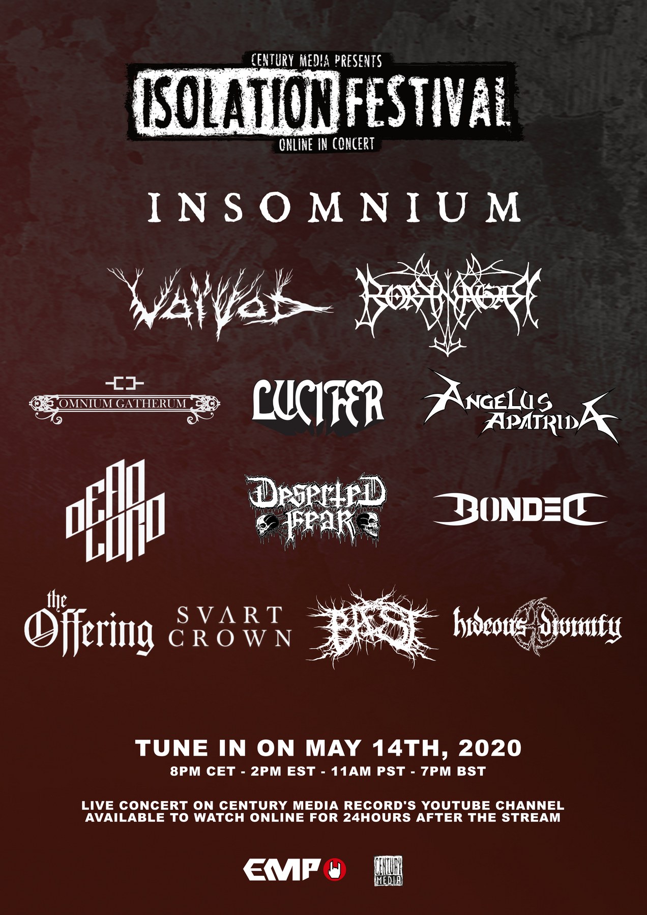 Century Media Records, in cooperation with EMP, proudly present the ISOLATION FESTIVAL. The Century Media ISOLATION FESTIVAL is a free online festival that will be hosted on Century Media’s YouTube channel on May 14th, 2020. The stream will begin at 8pm CET / 2pm EST / 11am PST and is going to be online for 24 hours.