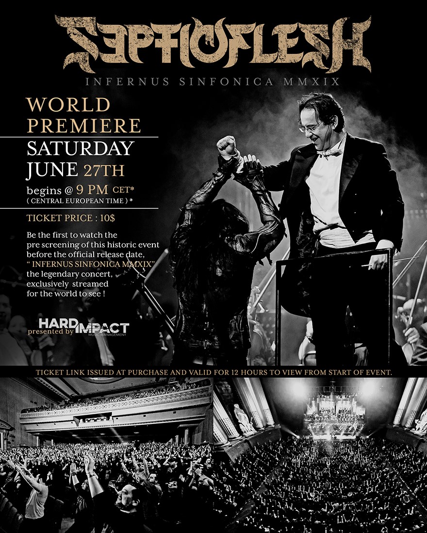 Septicflesh comment on the event: “We are very excited to share with our fans the chance to pre screen “Infernus Sinfonica MMXIX” , our very first concert with a full orchestra and choir on stage which was filmed in the heart of Mexico City. Our management team at Hard Impact arranged an exclusive streaming event for all of you to witness this before the official blu-ray release. The date is set for June 27th, beginning at 21:00 CET. Ticket link will be issued at purchase and will be valid for 12 hours to view from the start of the event. Sit back in the comfort of your home and watch the symphonies come to life!”