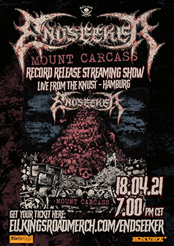 “We took all the frustration and despair over the cancelled shows and the whole misery Covid has brought upon us all and forged it into a bunch of straight forward, powerful songs that accompanied us through 2020 and will now be shared with the rest of the world. ‘Mount Carcass’ is definitely our most focused – in a way, even the angriest – record so far, and ‘Unholy Rites’, with its uplifting zombie-vibe, is the perfect opener for this new chapter in the history of Endseeker. We’d of course love to start this new chapter with YOU, our fans. Sadly, there won’t be a sweaty sold-out release show like last time, however, we’re back at the Knust in Hamburg on April 18th for a special livestream event (more details to be revealed soon). Come and celebrate with us online until we see each other in the pit again!”