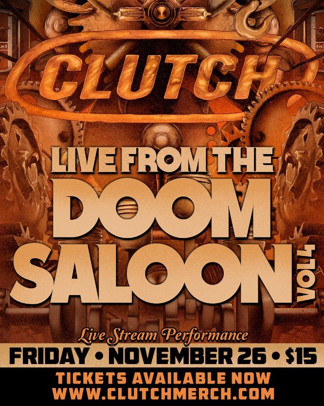 Clutch comment: “We just wrapped up tracking our new album so we’re ready to play a show! Come hang with us on November 26 for Live From the Doom Saloon Vol 4. We’ll stream this show live from our rehearsal pad. We’re gonna play something from every one of our albums and maybe even something brand new!”