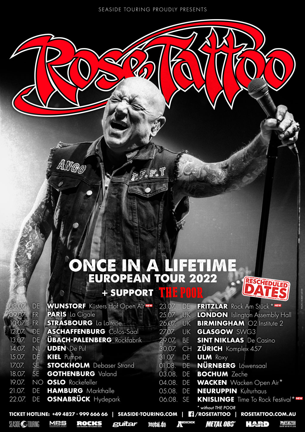 The tour has been postponed a couple of times due to the pandemic and here are the current dates of the ‘Once in a Lifetime’-tour that brings Rose Tattoo to Europe.
