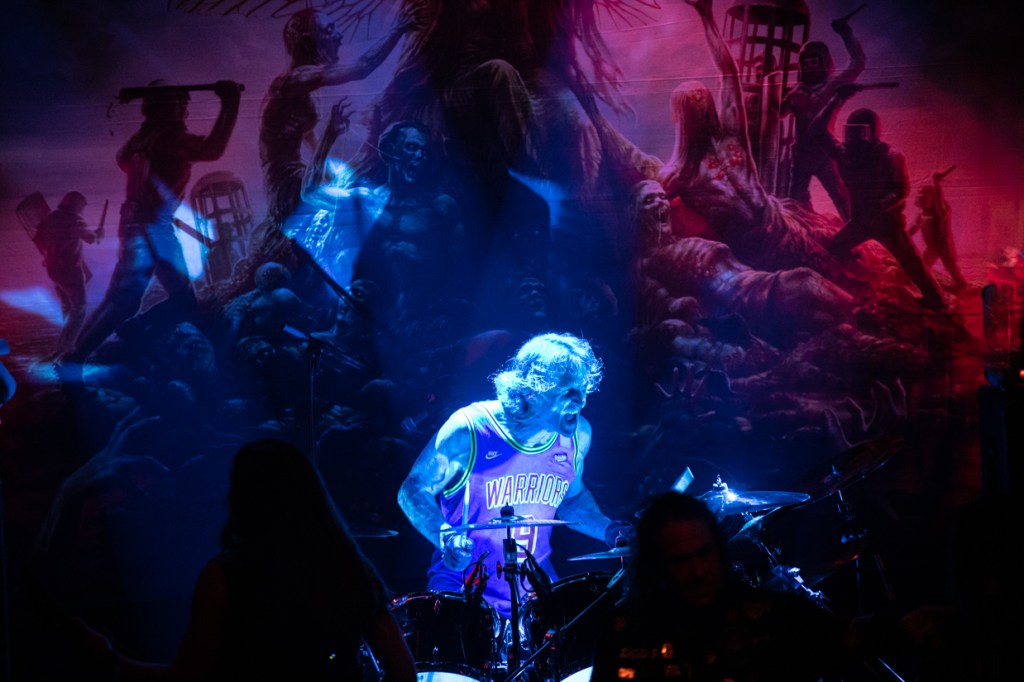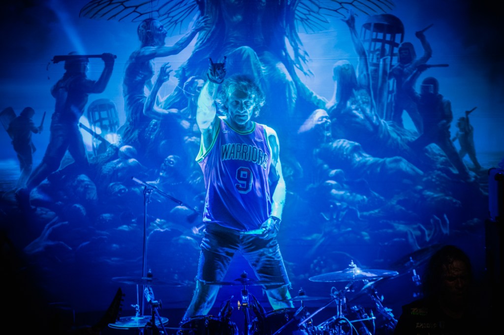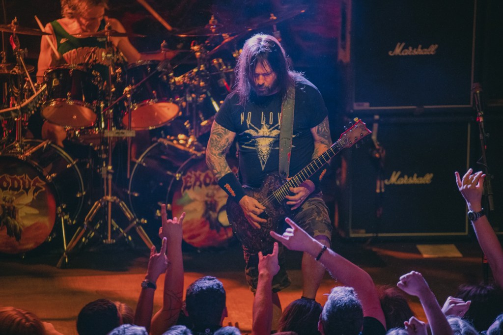 Of course Steve ‘Zetro’ Souza is not only an excellent singer, but also has a great entertainer talent. Mimics and gestures, furthermore permanently in motion, that’s what makes a true frontman. I already mentioned Brandon Ellis. He is an adequate counterpart to Gary Holt and the two are in perfect sync with each other. In addition, Ellis is a true guitar dervish, who goes to work with enthusiasm and agility. And while talking about it, Tom Hunting is also part of the action. Considering his serious illness in 2021, it was not a given. In the meantime, the exceptional drummer has fully recovered and is delivering maximum effort. Hunting is a hard-hitting rhythm engine that drives Exodus, and the sympathetic drummer doesn’t miss the opportunity to come to the edge of the stage himself to thank the fans for their terrific support. As Souza said, the metal community is like a family; there you help and support each other.