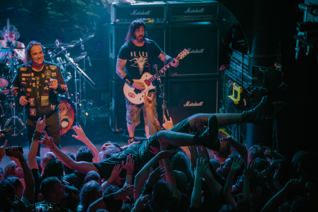 Of course Steve ‘Zetro’ Souza is not only an excellent singer, but also has a great entertainer talent. Mimics and gestures, furthermore permanently in motion, that’s what makes a true frontman. I already mentioned Brandon Ellis. He is an adequate counterpart to Gary Holt and the two are in perfect sync with each other. In addition, Ellis is a true guitar dervish, who goes to work with enthusiasm and agility. And while talking about it, Tom Hunting is also part of the action. Considering his serious illness in 2021, it was not a given. In the meantime, the exceptional drummer has fully recovered and is delivering maximum effort. Hunting is a hard-hitting rhythm engine that drives Exodus, and the sympathetic drummer doesn’t miss the opportunity to come to the edge of the stage himself to thank the fans for their terrific support. As Souza said, the metal community is like a family; there you help and support each other.