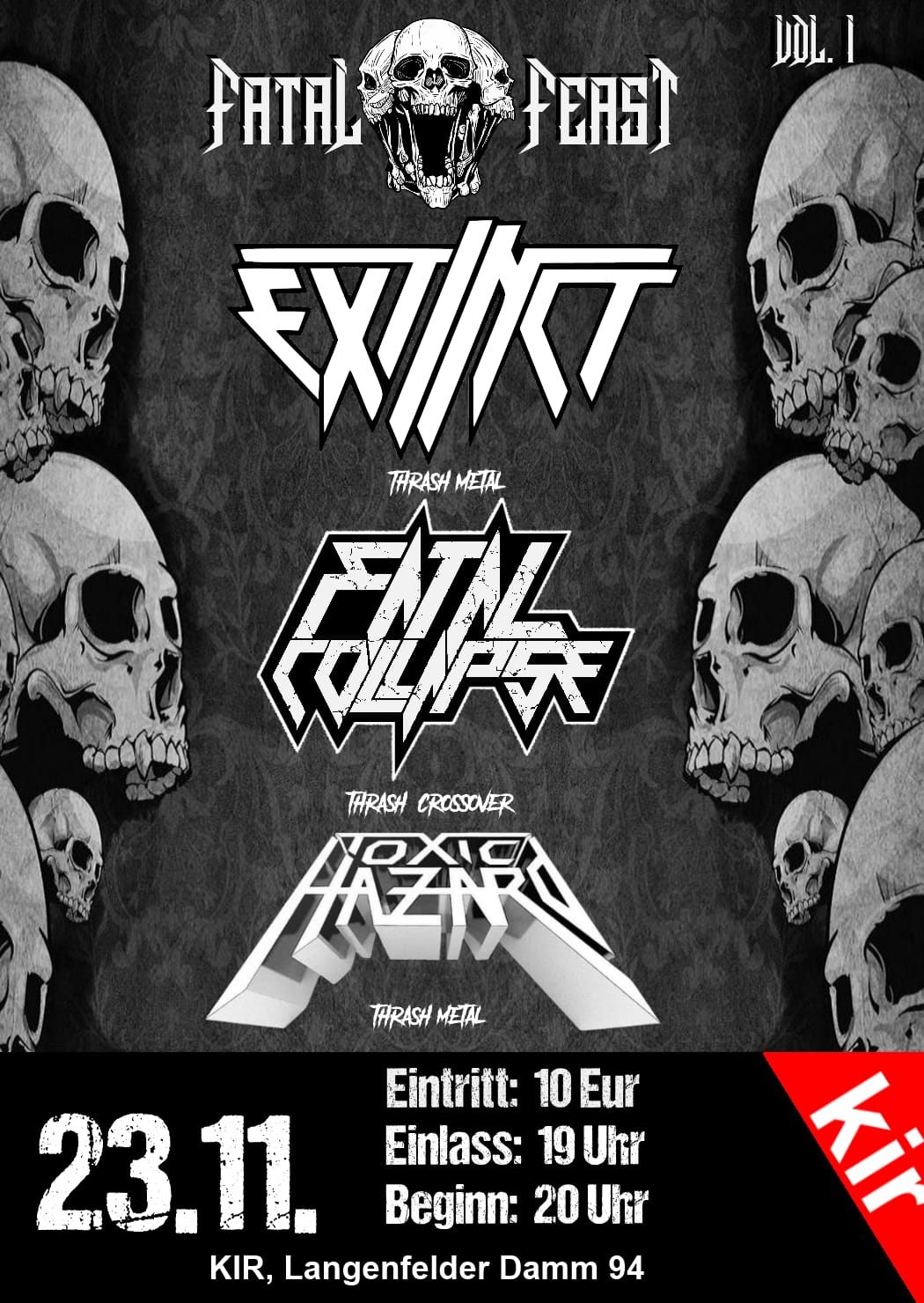 Fatal Feast Vol. 1 will take place on November 23rd, 2023 at KIR in Hamburg. Focus is on local thrash metal and the line-up features three bands: Extinct, Fatal Collapse and Toxic Hazard. So, time for a sweaty and beer-soaked metal party.