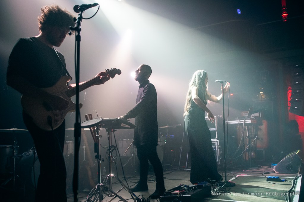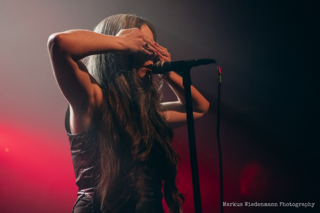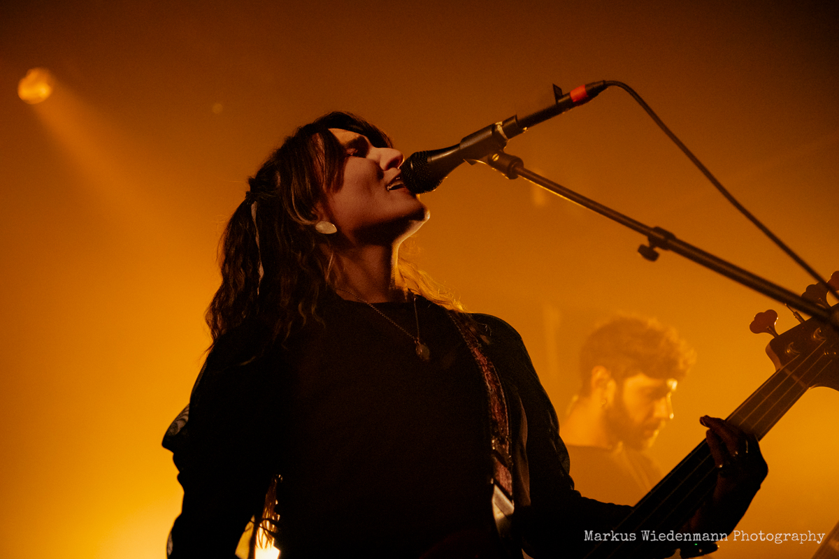 After a short changeover break GGGOLDDD come on stage. I had not seen the band live for some time and a few things have changed. Back then, it was 2017, GGGOLDDD were still GOLD and opened for Solstafir in Utrecht. Back then, the Dutchmen impressed with massive walls of guitars and an intensive stage presence. The latter has remained, which is not least due to singer Milena Eva. She experiences and lives through these very personal songs at every performance. Musically, the current set goes more in the direction recently taken on records. Occasionally the heavy guitar riffs still appear, but musically GGGOLDDD went more in the direction of electonica and that’s where the focus is tonight.