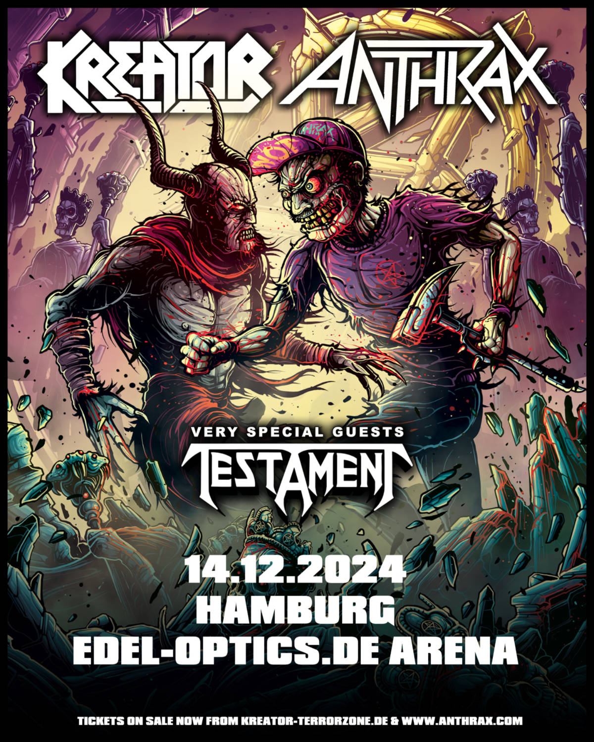 German thrash metal veterans Kreator will embark on a tour in very late 2024. Starting in November in Manchester, UK, the tour will end on December 15th, 2024 in Den Bosch, NL. One day earlier, Kreator will play a show at edel-optics Arena in Hamburg and with them on tour will be two thrash metal legends from the US. Anthrax and Testament will complete this exciting metal package of metal titans.