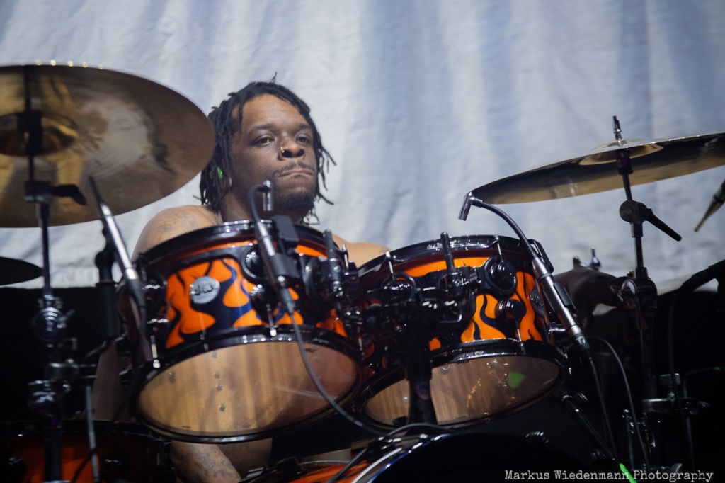 It doesn’t get less political with Fever 333. The fact that the band has a political message isn’t new to anyone who delves into their lyrics. Tonight the Gaza conflict is mentioned in a lengthy speech and the band also expresses their gratitude to the German fans who have always welcomed the band and made provided them a safe stay in the country. Anger at the current state of society and politics is what drives the four-piece’s music. Reminiscent in a broader sense of Rage Against The Machine, Fever 333 deliver a 40-minute set that bursts with energy. I don’t think any of the four musicians stood still for a second. There’s constant action and jumping on stage, while it’s the aggressive riffing that underlines the anarchic spirit of this show. Fever 333 live means a show that’s crazy and wild. Just how wild things get is illustrated the moment frontman Jason Butler suddenly sings ‘Hunting Season’ on the balcony at the other end of the room, including a breakneck performance in dizzying heights.
