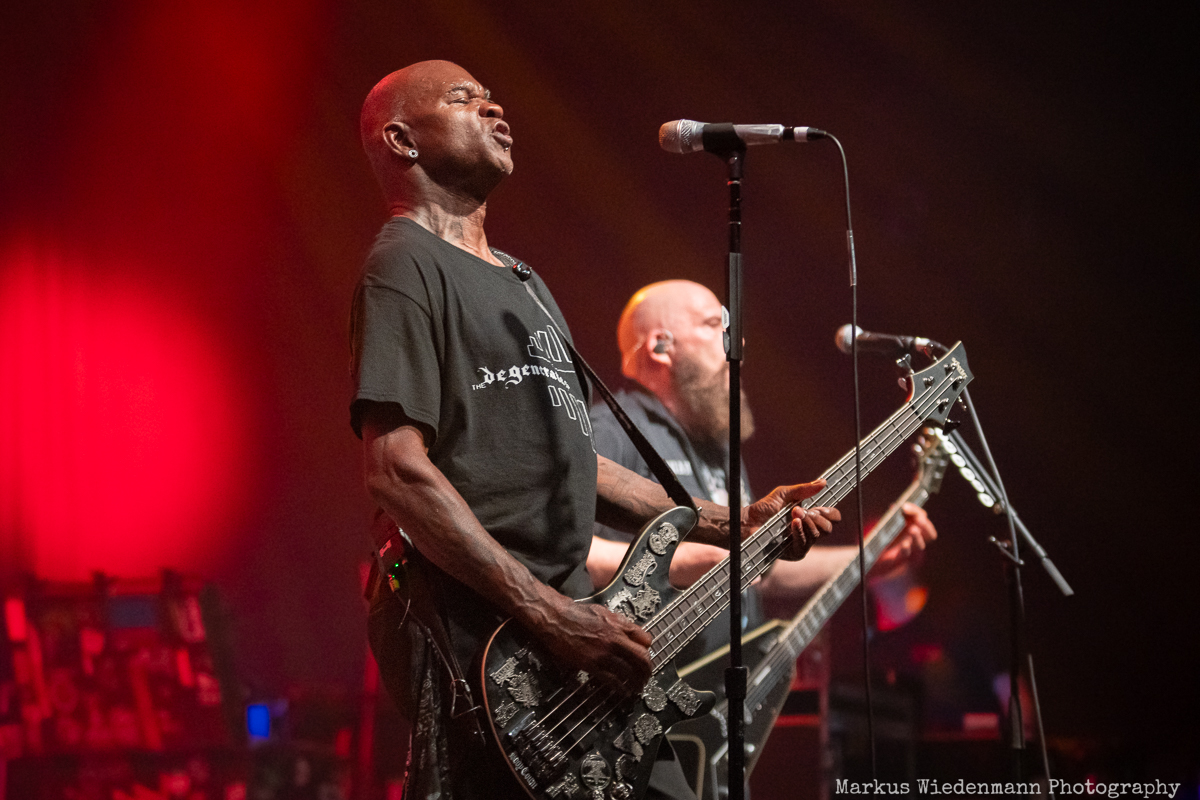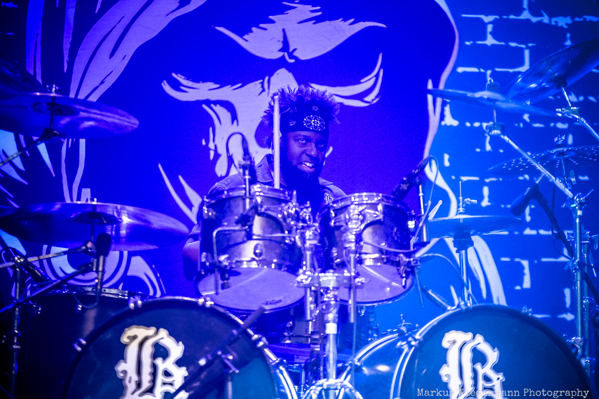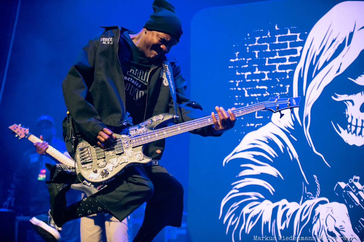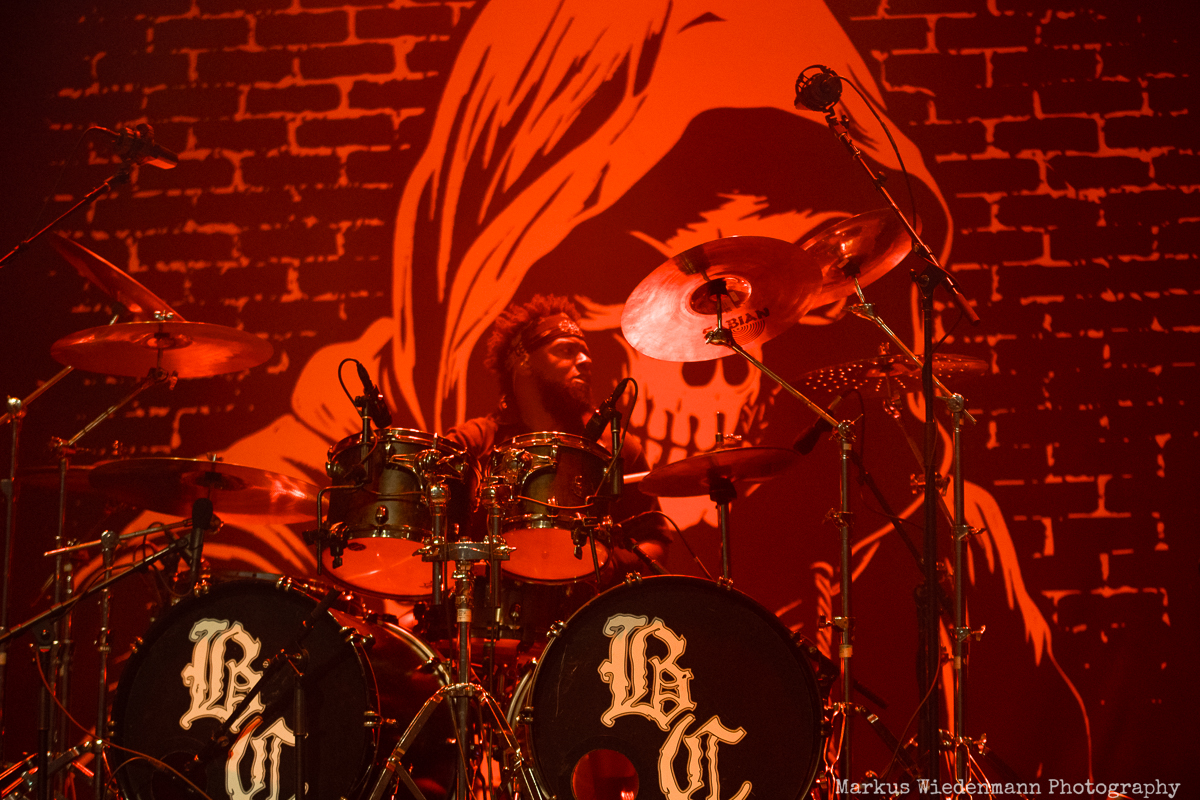 Time for Body Count. The stage is set and the Grim Reaper stares at you from the backdrop with a gun in his hand. The same image frames the drumkit when the band enters the stage at 21:00. It‘s a pretty smart move to put the Slayer cover “Raining Blood / Postmortem” very early on the setlist. Such a metal classic sets the tone for tonight and the fans go wild for the first time. The way Body Count start the night is a blast and kicks off 85 minutes of finest crossover.