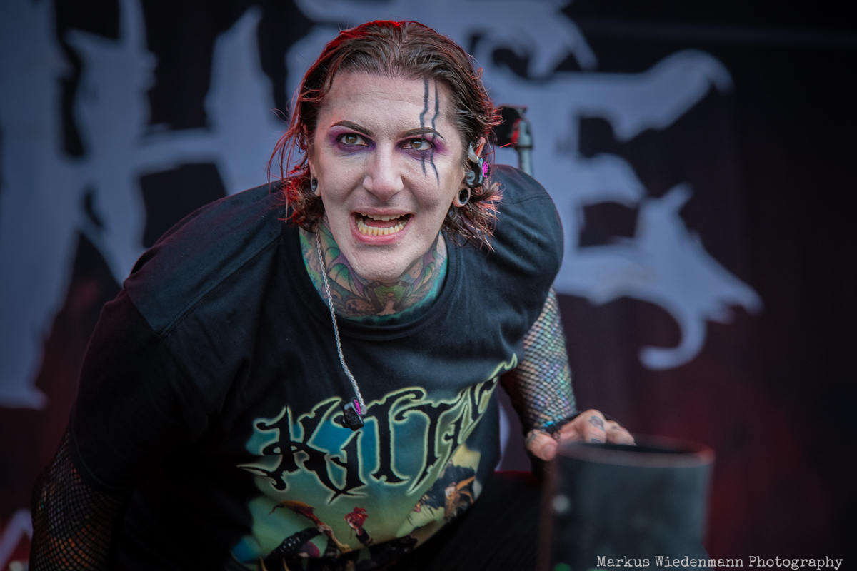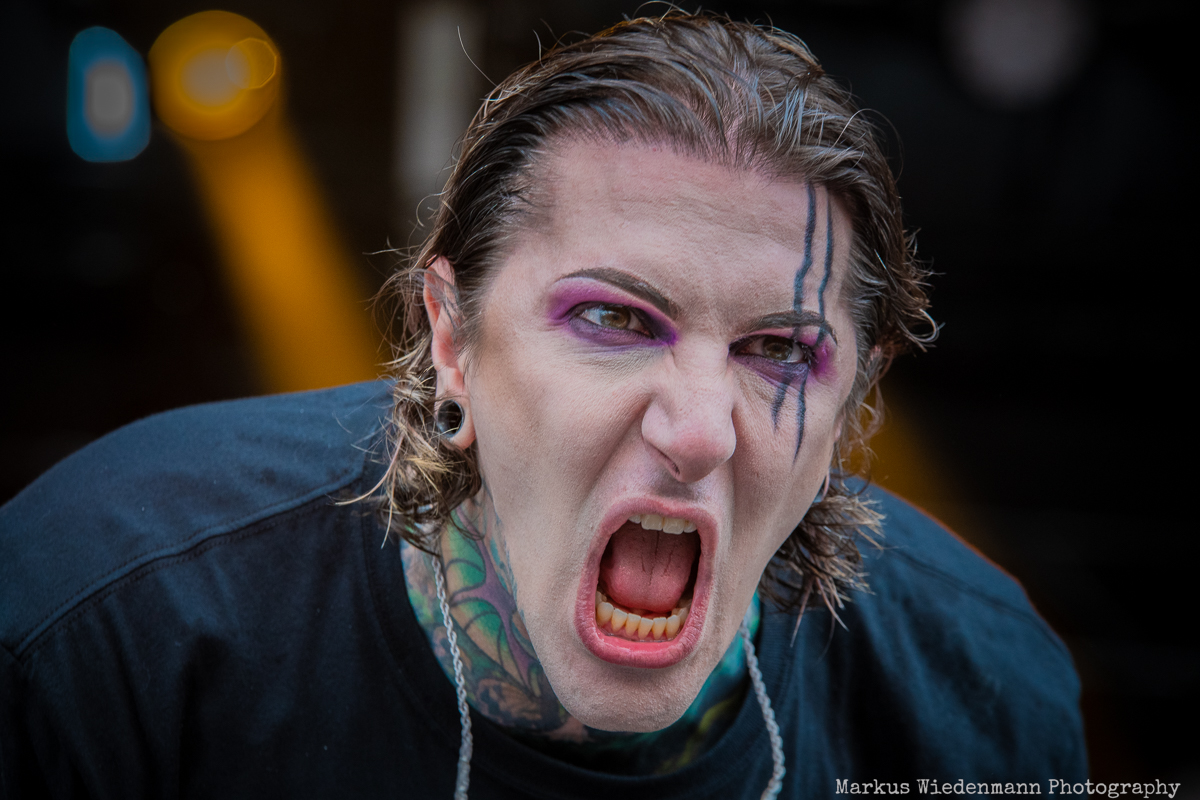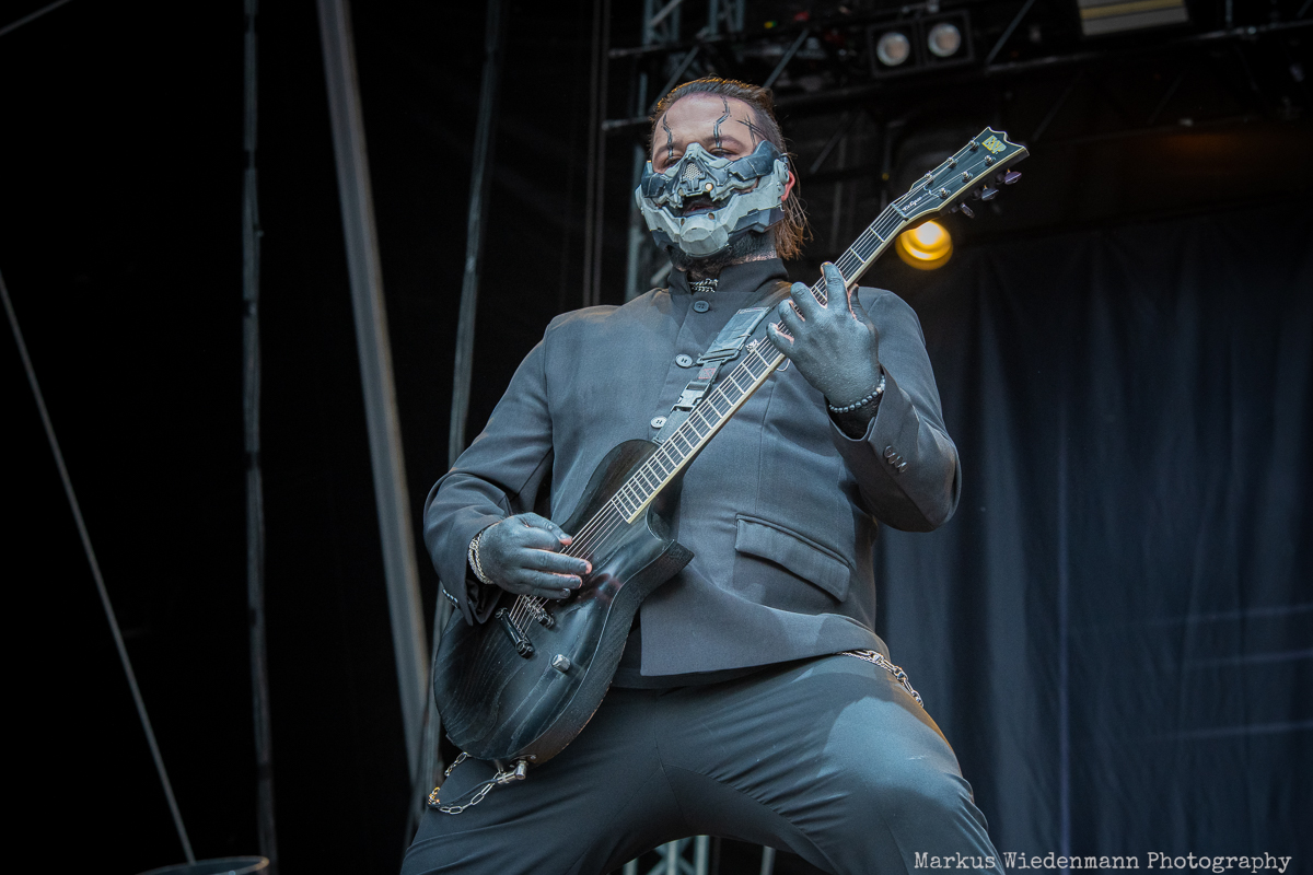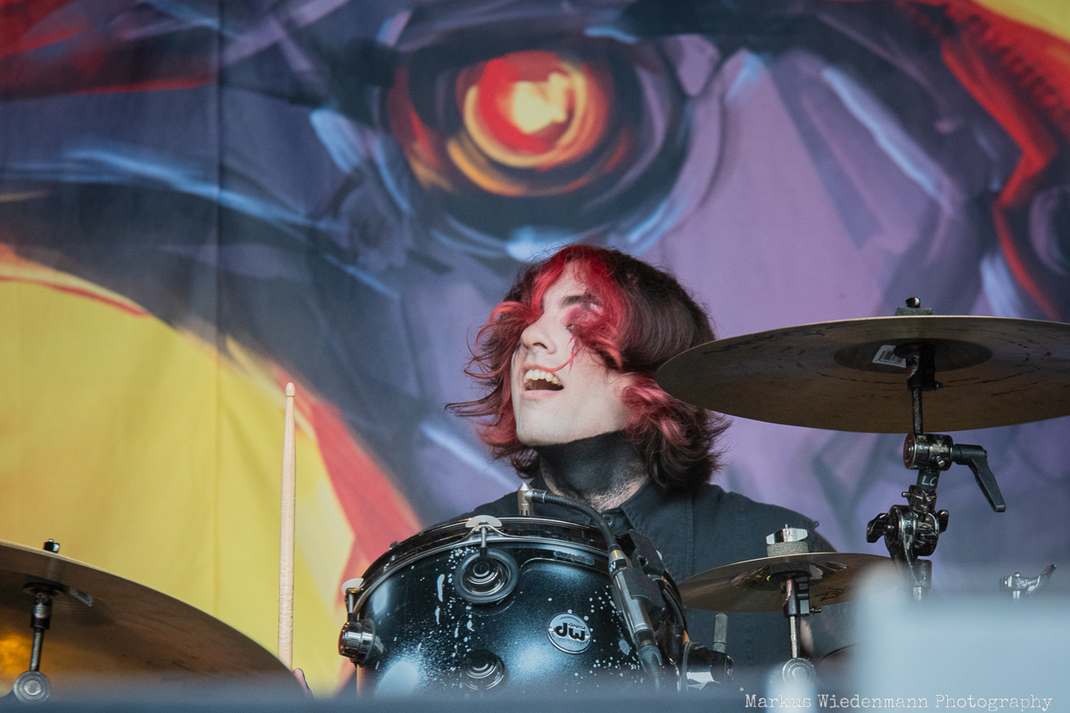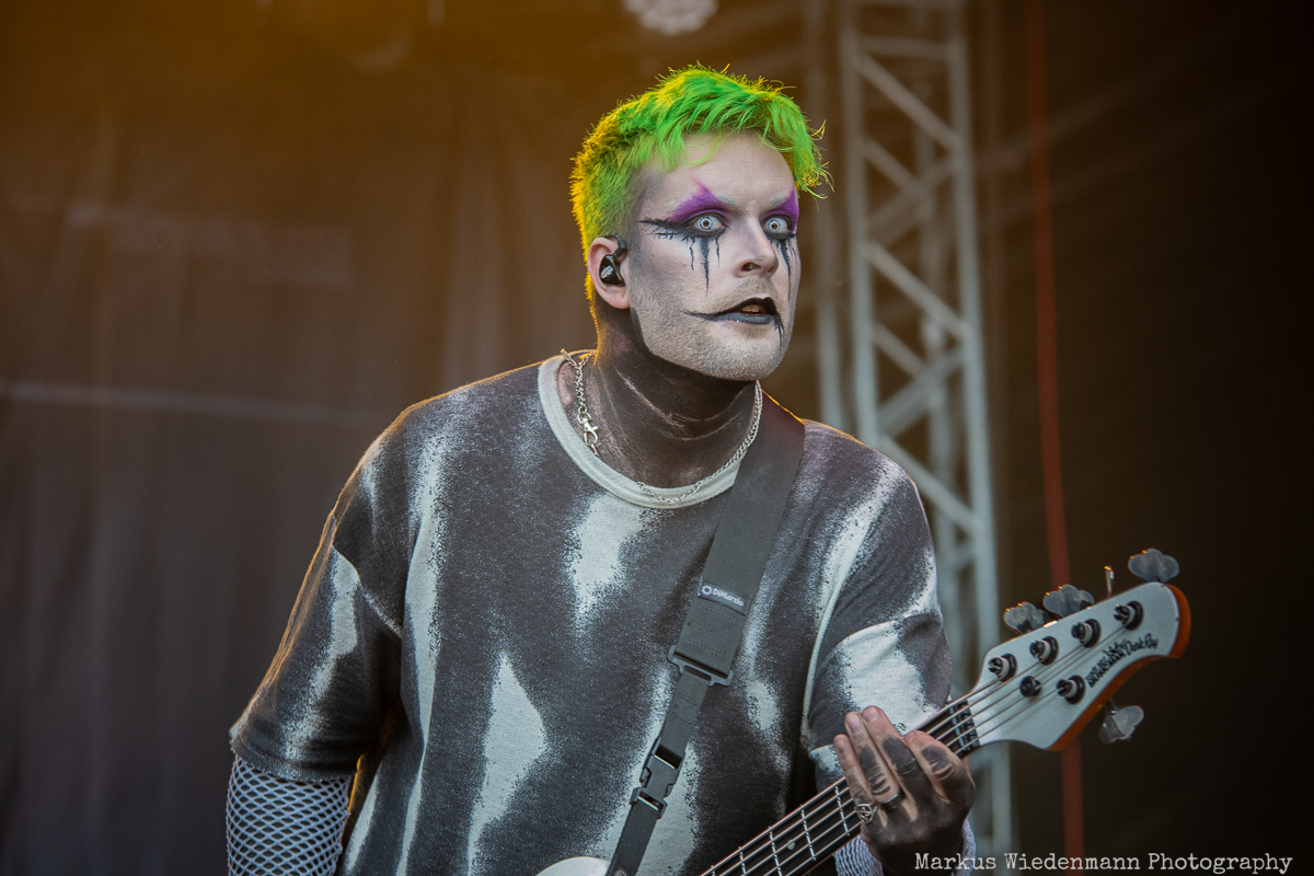 Shouting and constantly moving, the singer is a great entertainer too. In general it has to be said that Motionless In White don’t just play a show. These guys have a concept for the band that includes the music and the visual aspect. Masks and make up may not be the new and fancy thing, but it fits this band and adds to the experience. Despite playing at a time with sunshine and a summer ambience, the Americans managed to get the dark metal blast across with fans starting circle pits, crowd surfers on their way and the aforementioned female fanbase that seems to be screaming in full excitement during the entire show. It is the fusion of a gothic vibe and blasting metal that makes the music of this band to an infectious musical experience.