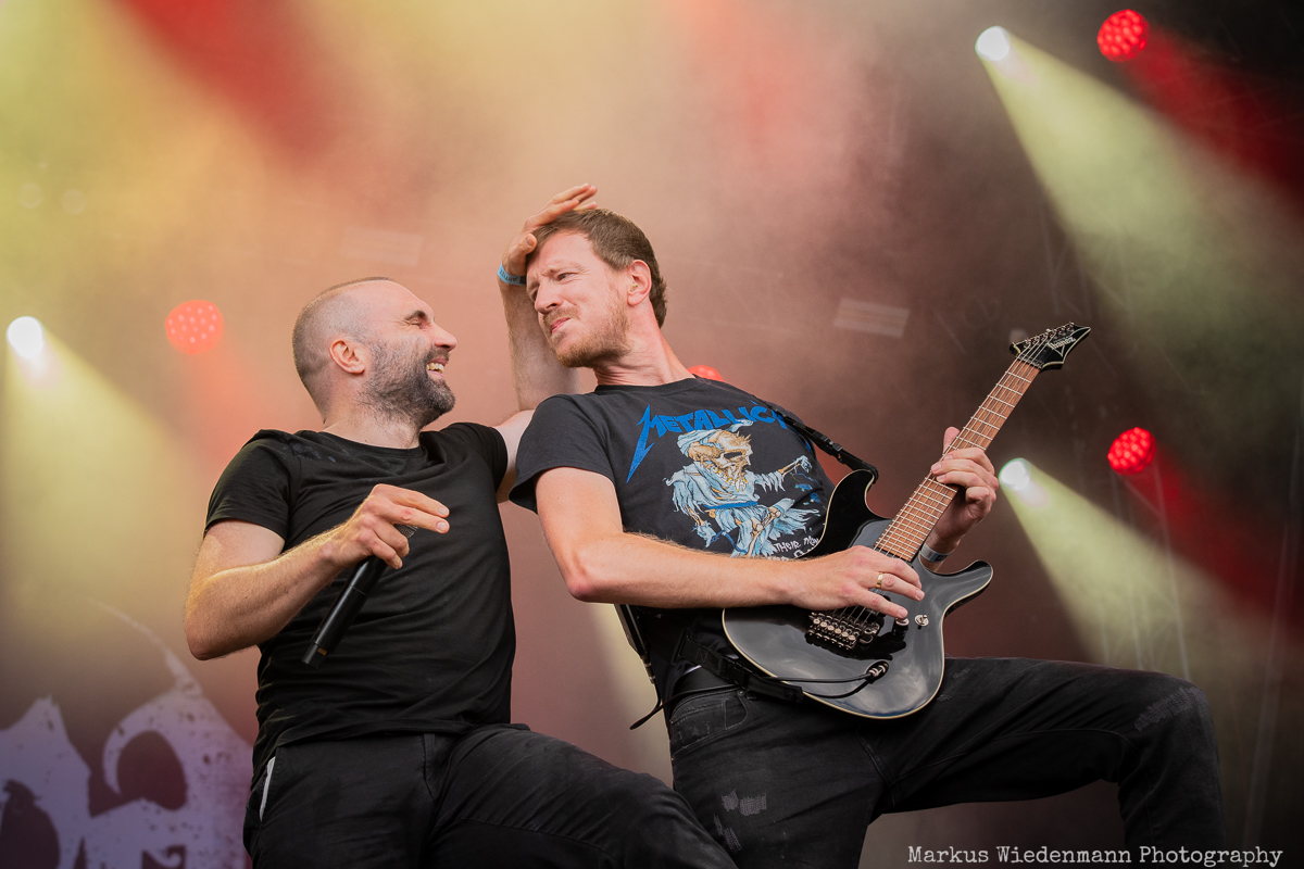 Neaera, the band with the difficult name, released a brilliant new album with “All is Dust” and the guys don’t waste any time to bring the energy of the album on stage. The first notes of the opener “Armamentarium” just hit the fans while frontman Benjamin Hilleke is already on his way from the stage into the crowd. He sings and screams in the middle of a small wall of death, before the crowd absorbs the singer. Band and fans as one unit. It is often an abstract description, while today offers the real fusion of both.