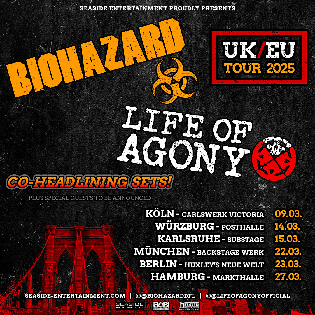 Two veteran bands when it comes to hardcore join forces and will embark on a co-headliner tour through Europe in early 2025. Biohazard and Life Of Agony will be on the road together, playing shows in 24 cities in Europe and UK.