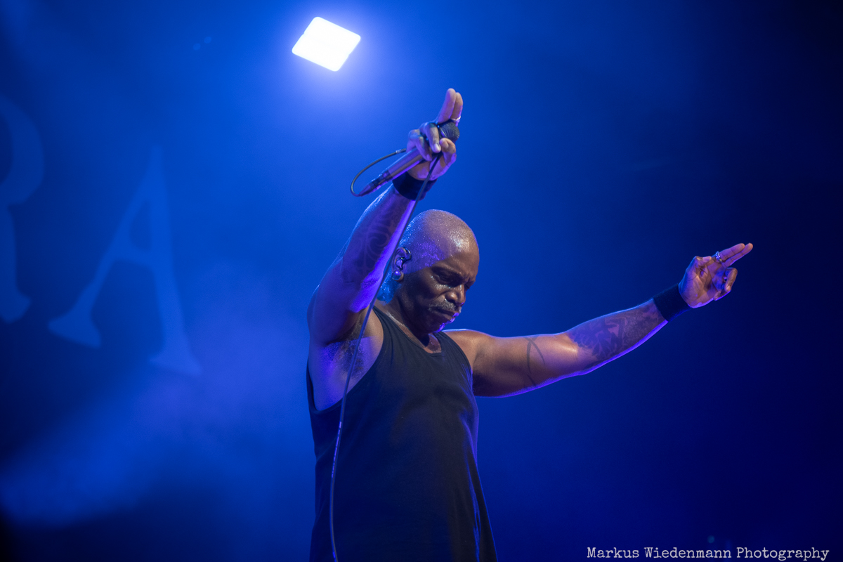 With “Slave New World” a third song from the “Chaos A.D.” album follows and it is obvious that everyone on stage is having a lot of fun tonight. Andreas Kisser is full of energy and on stage with 100% commitment. Besides his great guitar skills with well executed solo parts, Kisser doesn’t stand still for a second and the same goes for the mighty frontman Derrick Green. His stage presence is impressive. Tall and muscular, Green is visually the centre of the stage and metal runs through his veins.