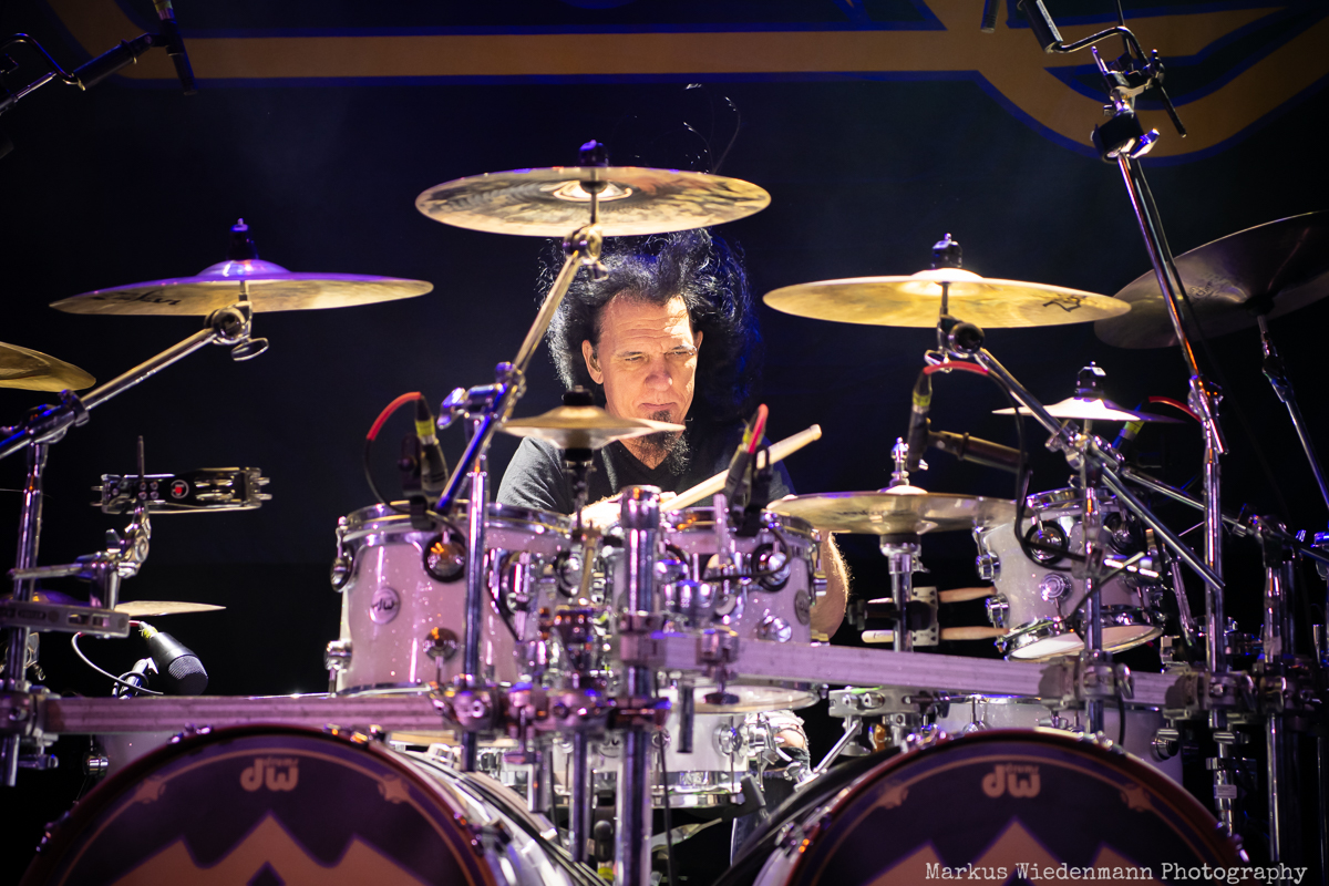 After playing the first two releases in chronological order, the five-piece adds three more highlights to the set. “Walk in the Shadows” is one of them and the title track of the “Empire” release is another. Enthusiastic fans can be seen all over the room, even in the back of the Fabrik also when “Eyes of a Stranger” fills the room.
