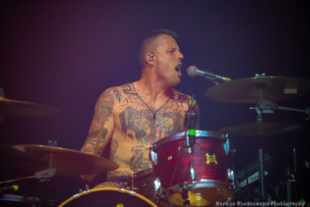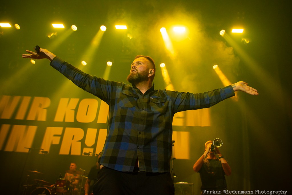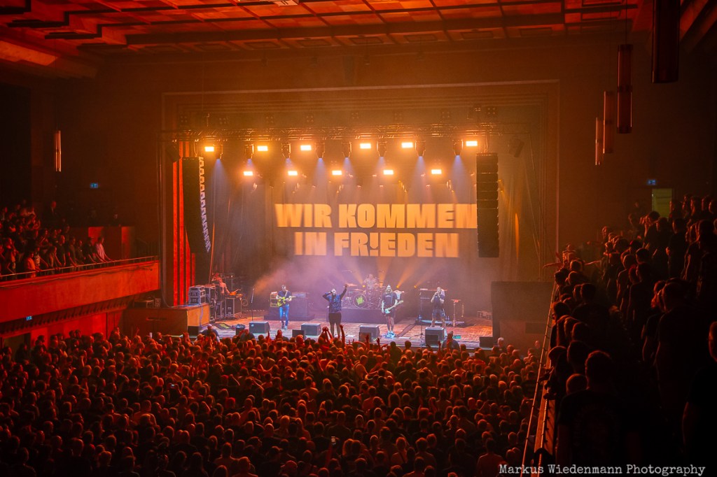 The moment the lights dim and the Die Toten Hosen‘s version of “Halbstark” fills the room, it is showtime. Following a brief piano-driven introduction accompanied by a gradually intensifying light behind the drum kit, Feine Sahne Fischfilet kicks off their set with the title track from their latest album. The crowd was already quite lively during the introduction, but the venue transformed into a madhouse as soon as the first song of the night began. What follows is more than two hours of pure energy and adrenaline.