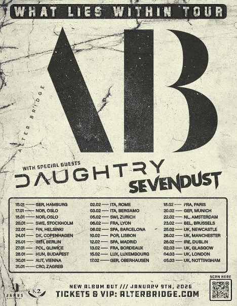 Alongside the announcement of their new album, Alter Bridge are unveiling their big “What Lies Within Tour”. The 31-show European tour starts on January 15, 2026 in Germany and ends on March 5 in Nottingham (UK) – with Daughtry and Sevendust! The pre-sale starts on July 18. All info and VIP packages: http://www.alterbridge.com.