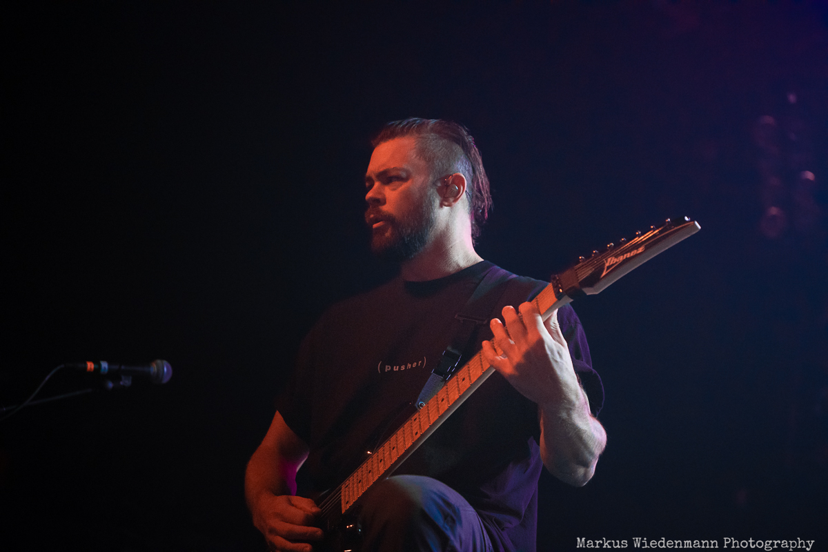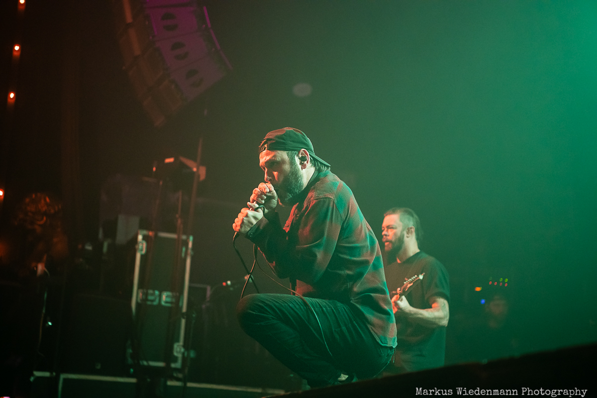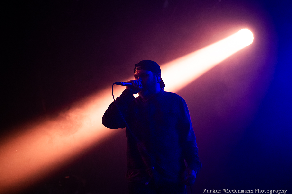 The show starts early tonight. Great American Ghost takes the stage at 6:30 p.m. sharp. The Boston-based metal band opens with “Hymn of Decay” and suffers from some sound issues. It’s a massive start, though, and since the sound improves quickly, we witness a very intense set. The fusion of blasting beats, grooving moments, and Ethan Harrison’s strong presence makes this a great way to start a night full of metalcore. During “Lost in the Outline,” Harrison joins the circle pit in the crowd before starting “Kerosene” with a short speech about global problems related to social imbalance and political menace. Great American Ghost has 30 minutes for their six-song set, which ends with a new song, “Forsaken.” And what could be a better finale than shouting the last parts of the song from the bar counter in the hall? Great American Ghost got everyone fired up and set the stage for the next band.