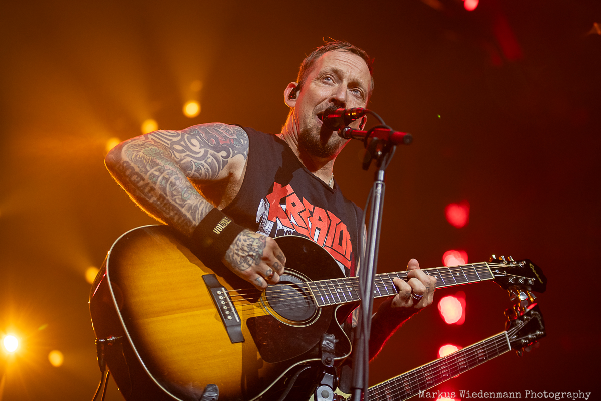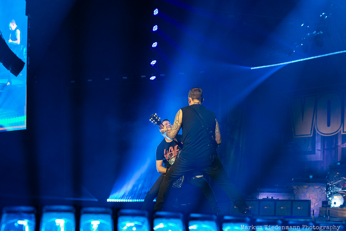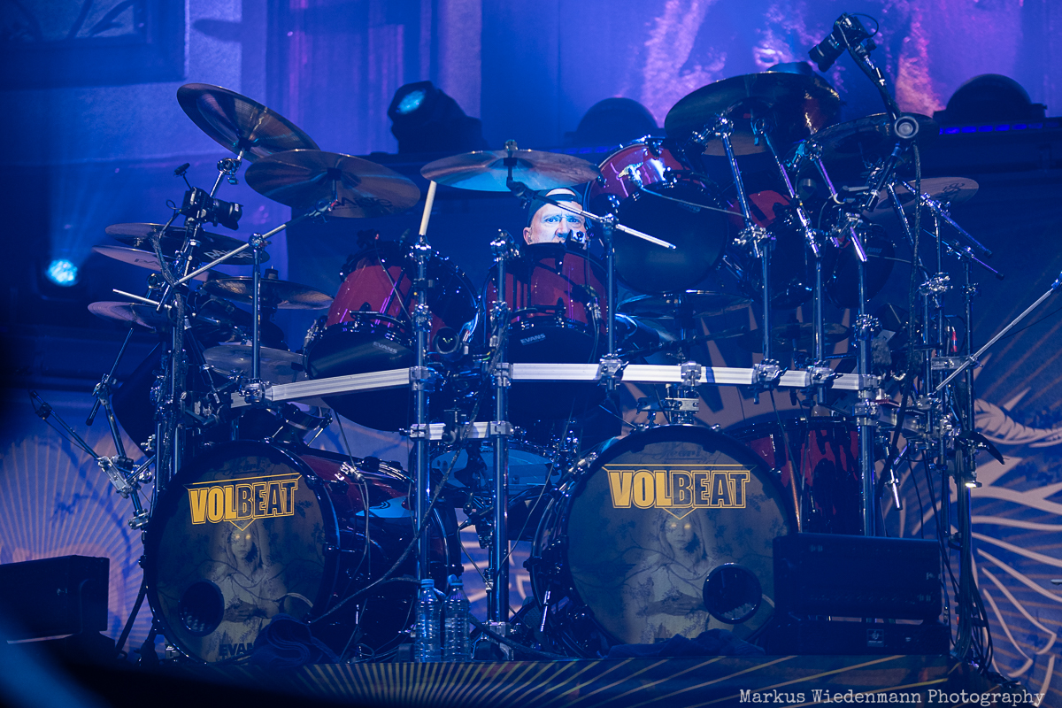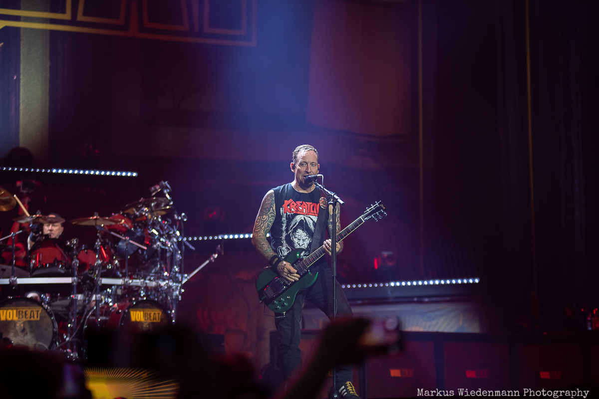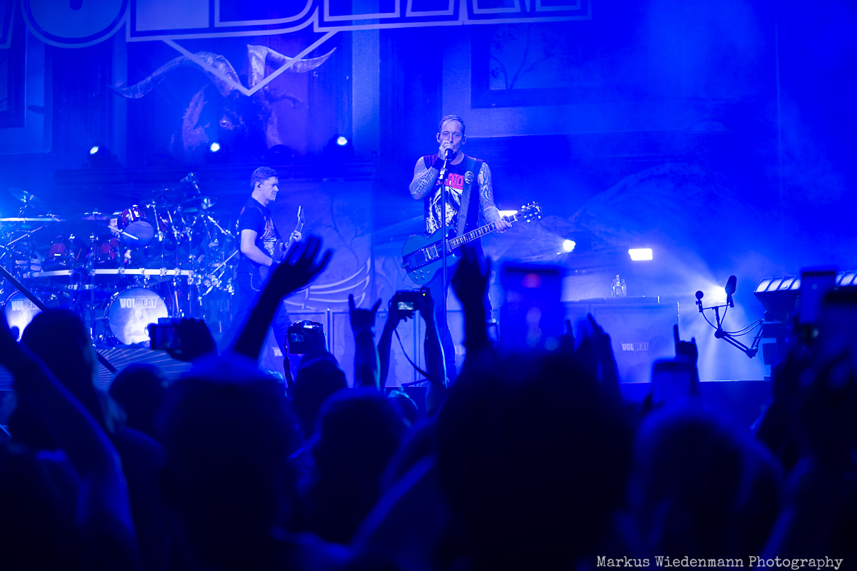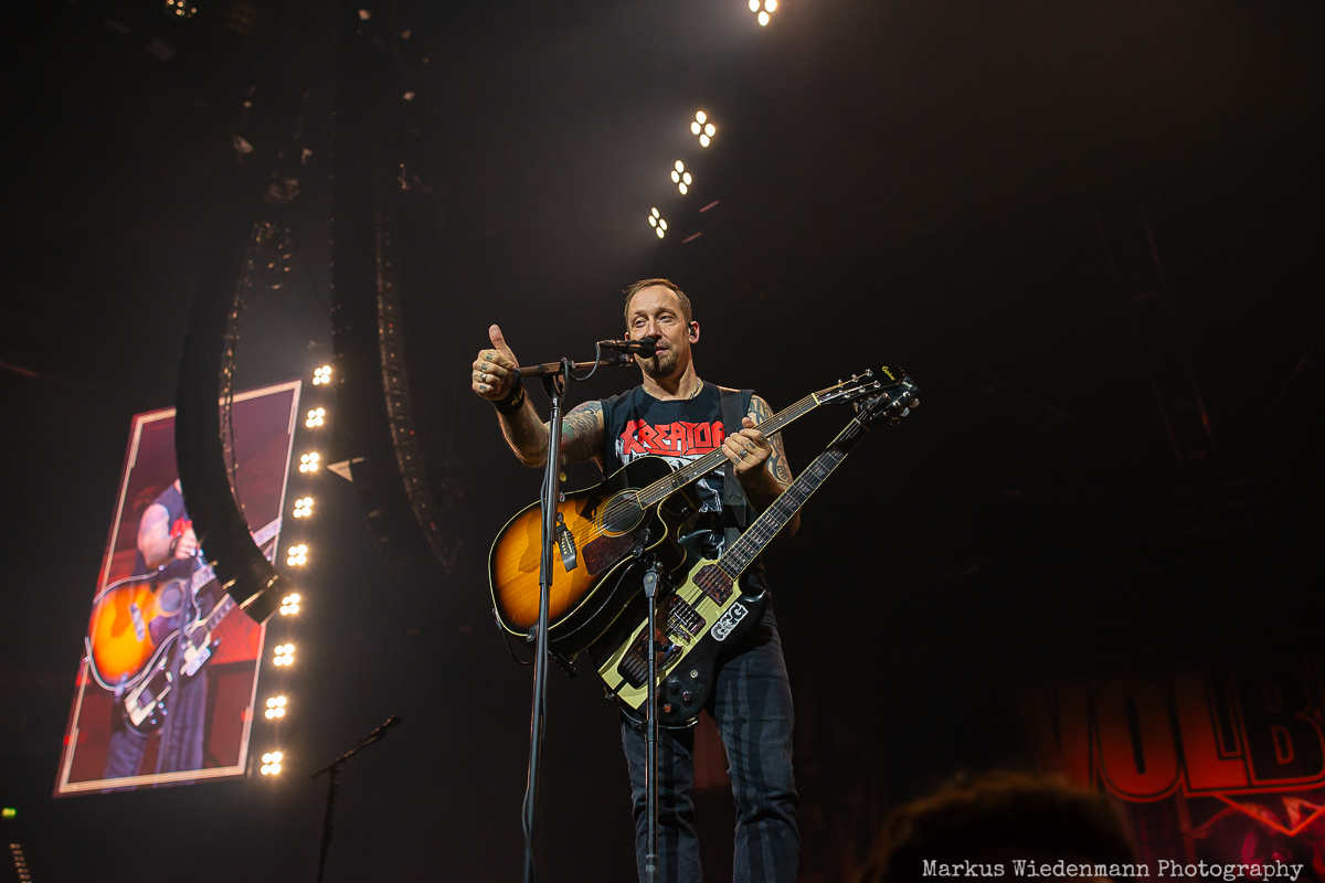 Volbeat‘s career path is impressive. From the time when frontman Michael Poulsen personally sent the first demo CD to a prominent act that now fills big arenas, it has been an impressive development, with no end in sight. As mentioned earlier, tonight’s show is sold out, and the fans make it clear why they bought their tickets. While there was initial euphoria in the hall at the end of the Bush set, the next peak of enthusiasm is reached when the lights go down and the huge curtain with the silhouettes of the four band members comes into focus. The curtain falls, and the show starts. Volbeat opens with “The Devil’s Bleeding Crown,” and the second song isn’t from the new album either. “Lola Montez” is from the 2013 album “Outlaw Gentlemen & Shady Ladies,” followed by “Sad Man’s Tongue.” Poulsen introduces the song with a short Johnny Cash intro, kicking off the tune with an acoustic guitar at the end of the runway.