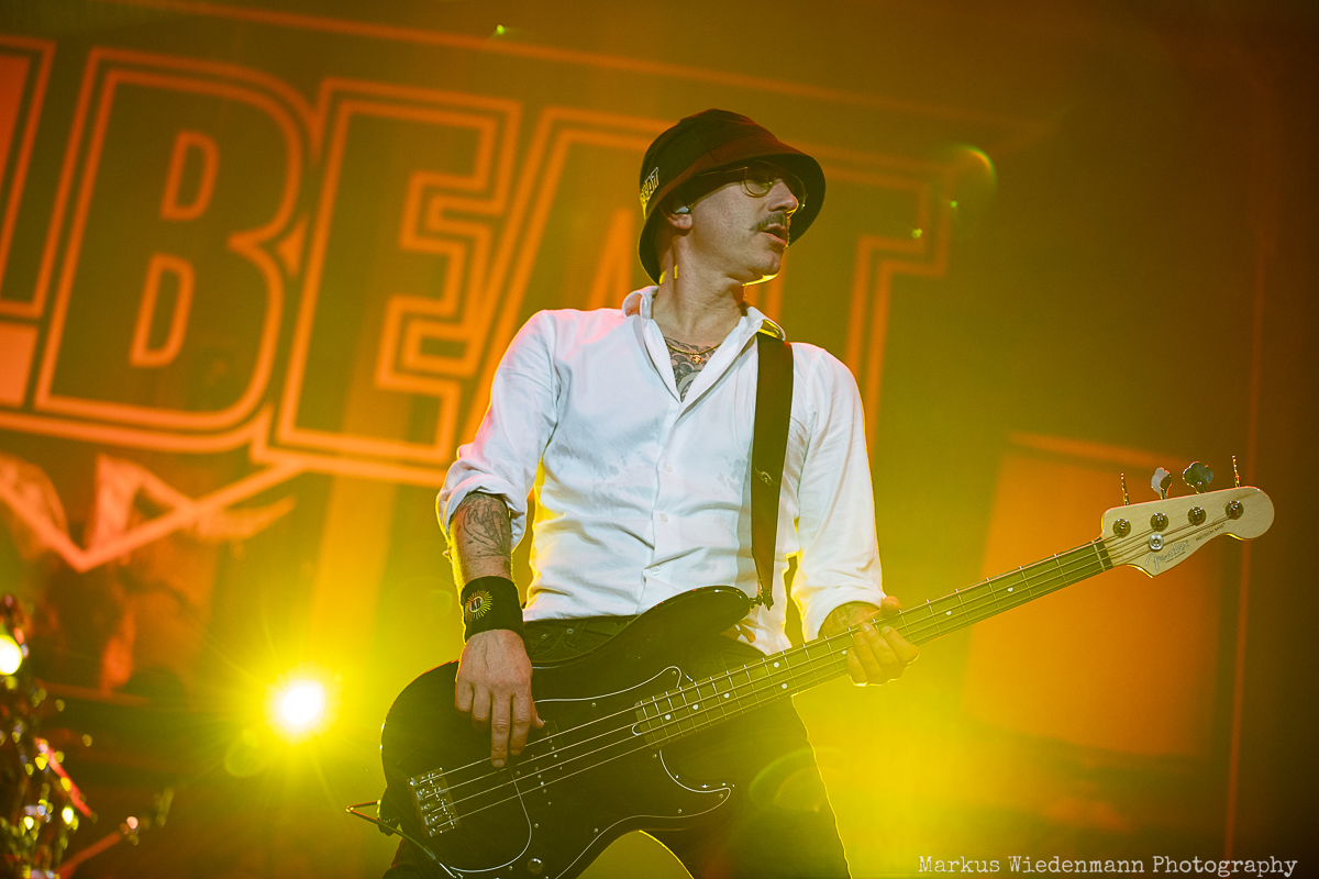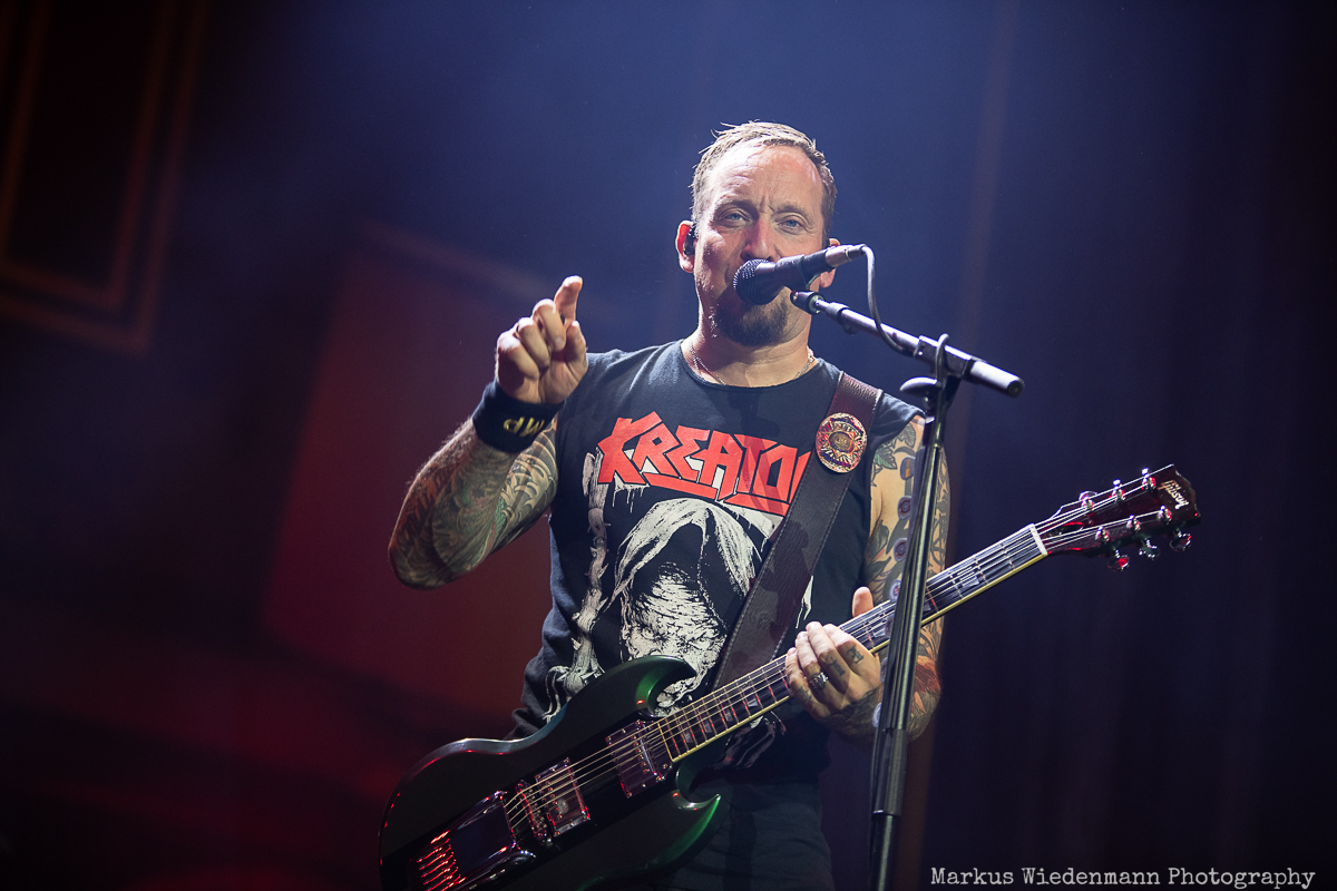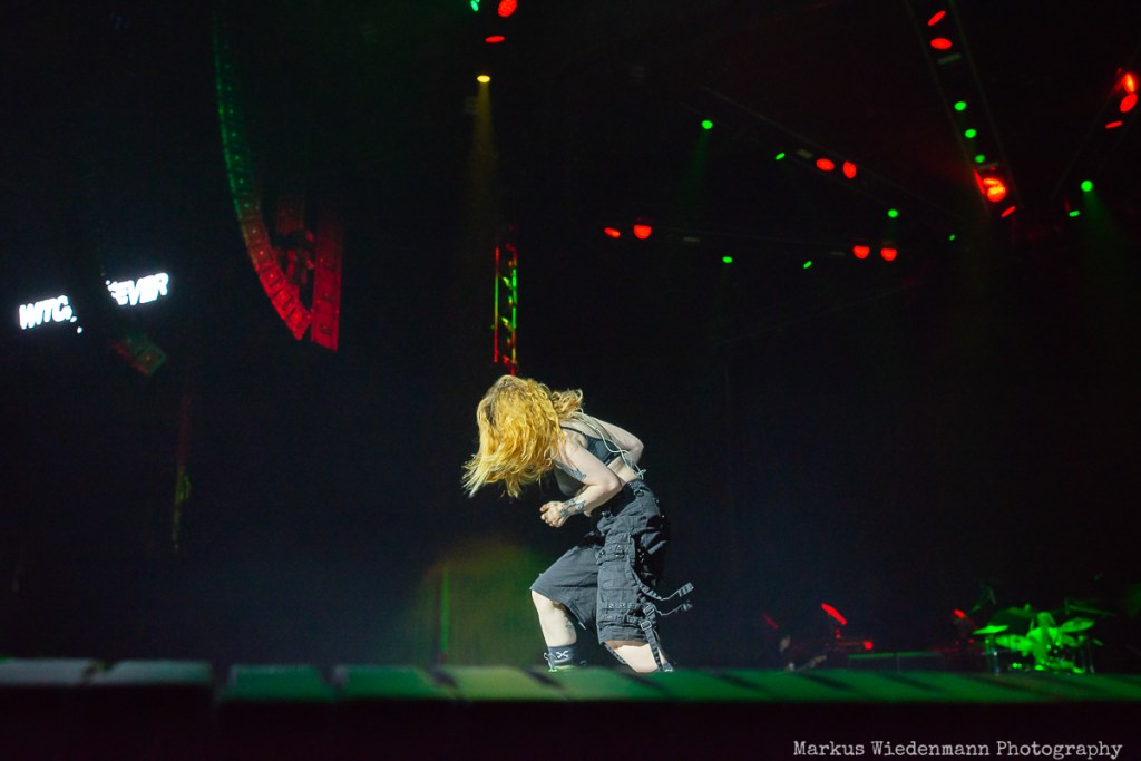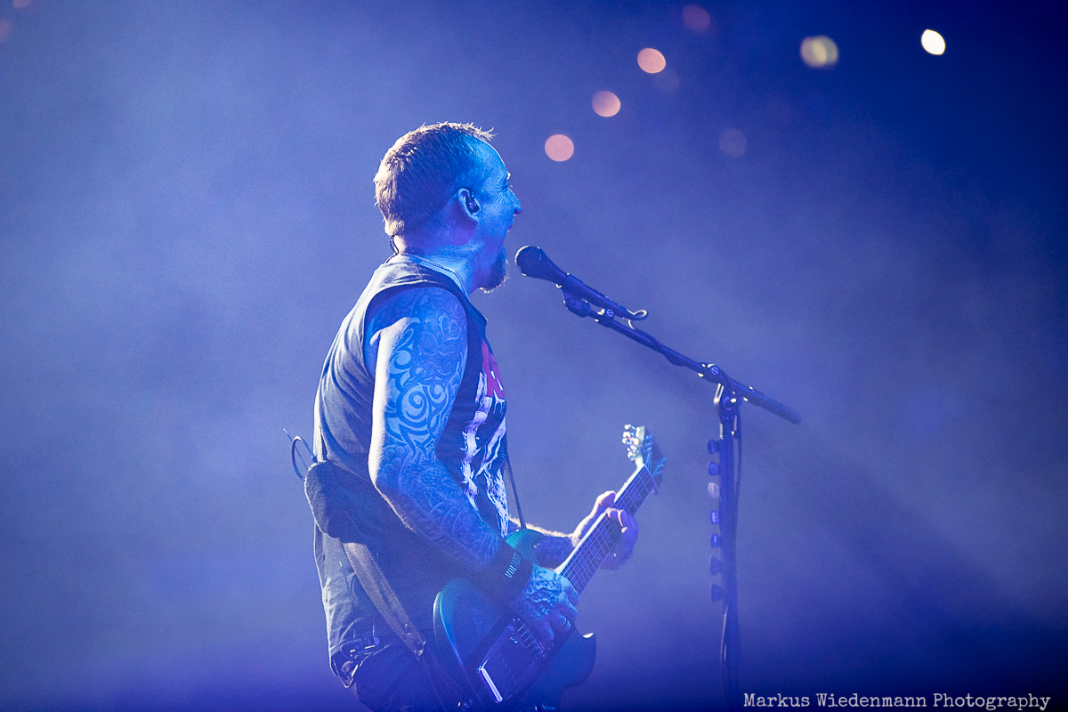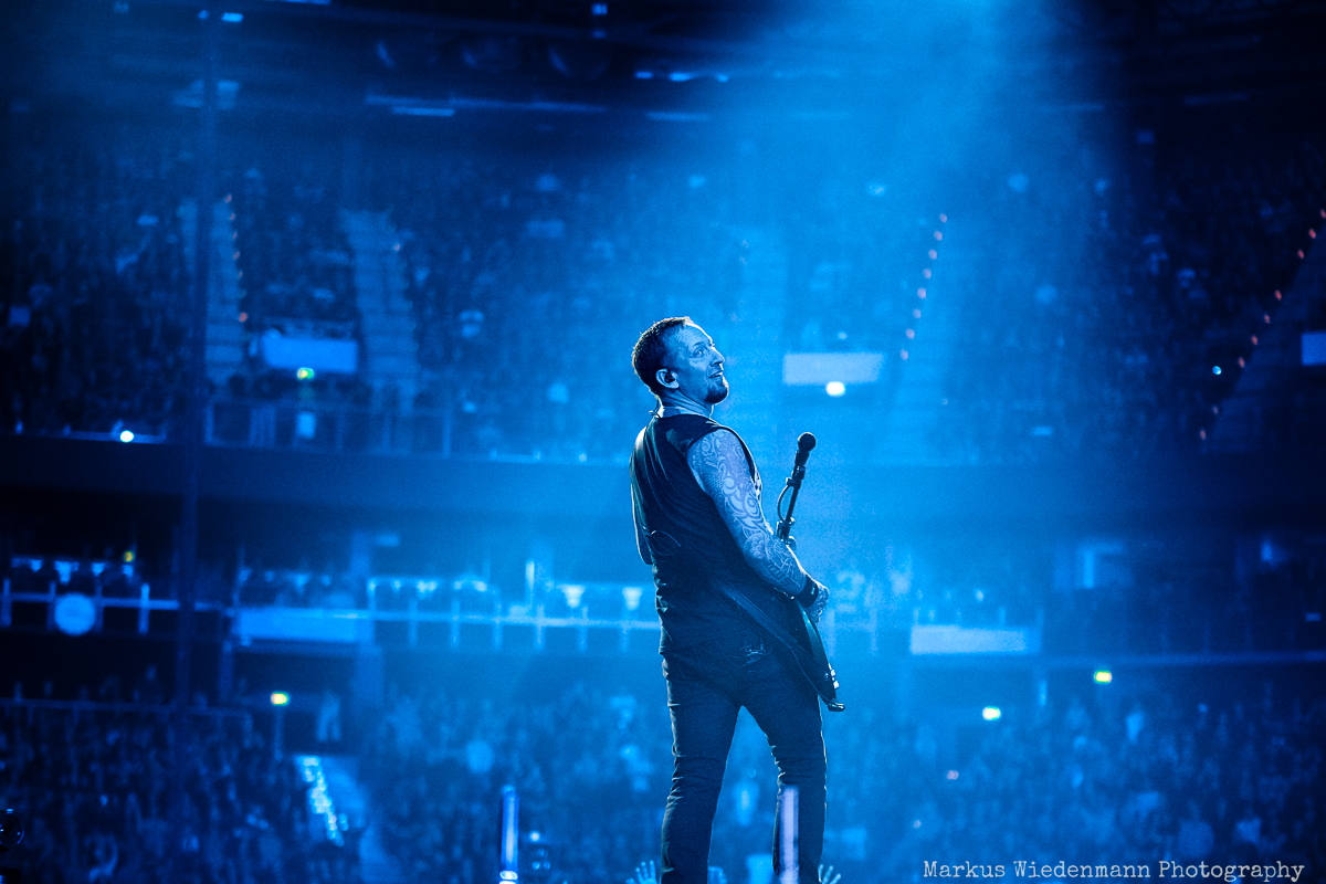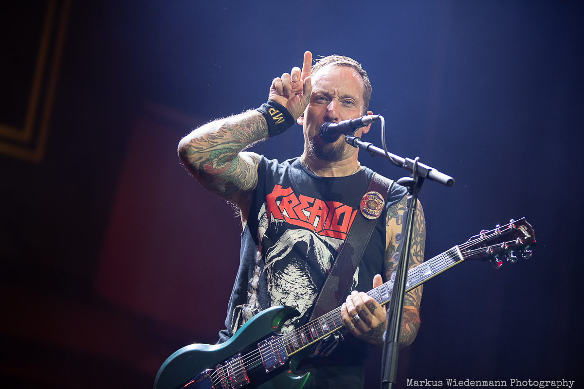 Volbeat‘s career path is impressive. From the time when frontman Michael Poulsen personally sent the first demo CD to a prominent act that now fills big arenas, it has been an impressive development, with no end in sight. As mentioned earlier, tonight’s show is sold out, and the fans make it clear why they bought their tickets. While there was initial euphoria in the hall at the end of the Bush set, the next peak of enthusiasm is reached when the lights go down and the huge curtain with the silhouettes of the four band members comes into focus. The curtain falls, and the show starts. Volbeat opens with “The Devil’s Bleeding Crown,” and the second song isn’t from the new album either. “Lola Montez” is from the 2013 album “Outlaw Gentlemen & Shady Ladies,” followed by “Sad Man’s Tongue.” Poulsen introduces the song with a short Johnny Cash intro, kicking off the tune with an acoustic guitar at the end of the runway.