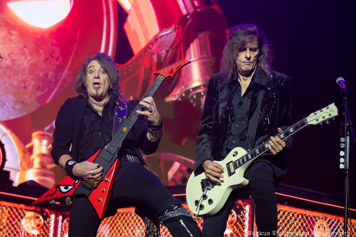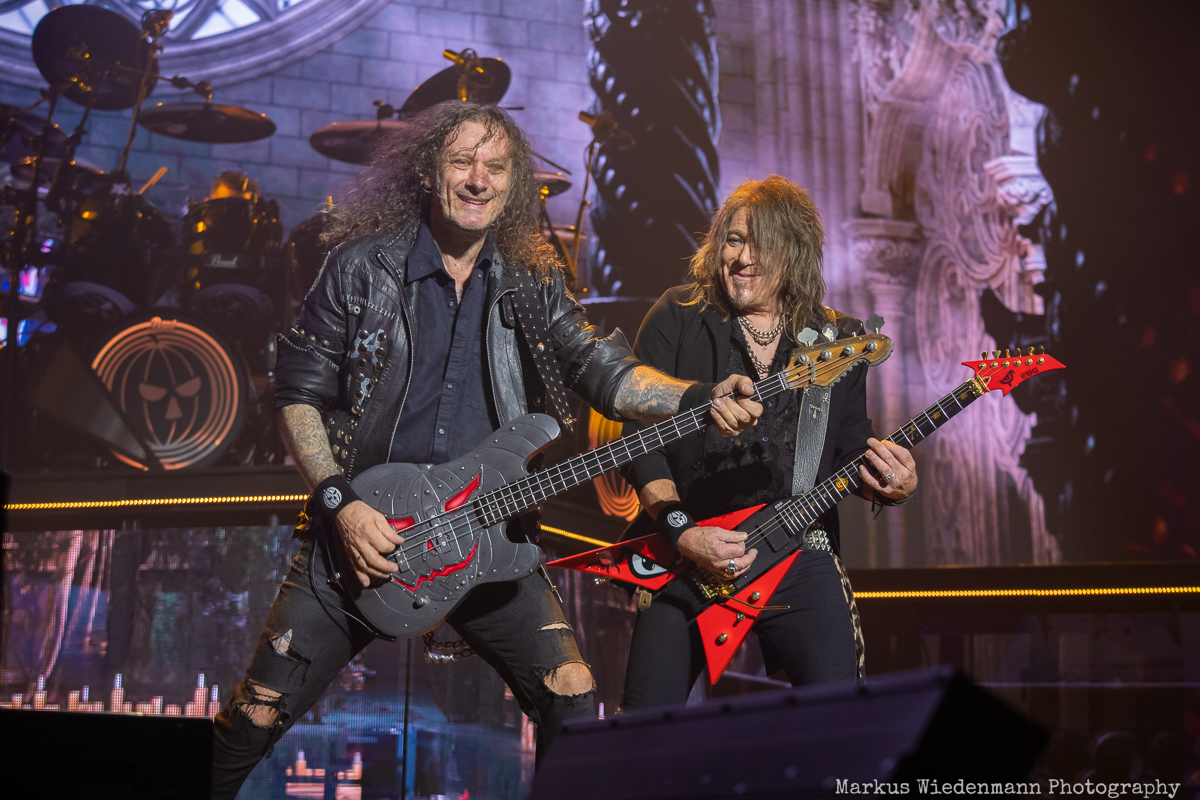 Helloween generate infectious energy, and everyone contributes to it. The triple axe attack, Markus Grosskopf’s grooving bass and Löble’s hard-hitting drumming are the essentials of Helloween. Combined with the great vocals of Michael Kiske and Andi Deris, who harmonise perfectly, Helloween deliver a memorable metal show, which slowly transitions into a shorter acoustic segment featuring just the two singers. With a twinkle in his eye, Deris announces that this is the moment for the smokers in the band, while the two singers perform “Pink Bubbles Go Ape”, “In the Middle of a Heartbeat” and “A Tale That Wasn’t Right”. It is the latter that acts as a bridge back to the regular set, which ends with a stellar version of “Halloween”.