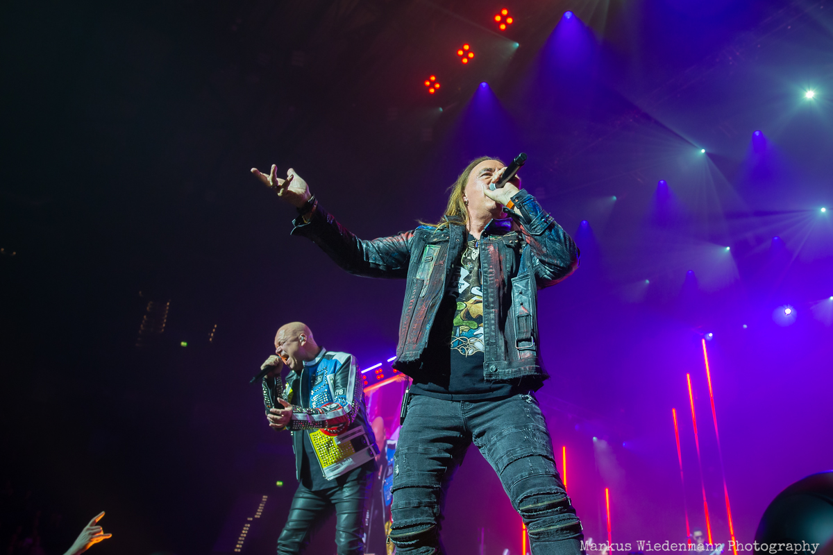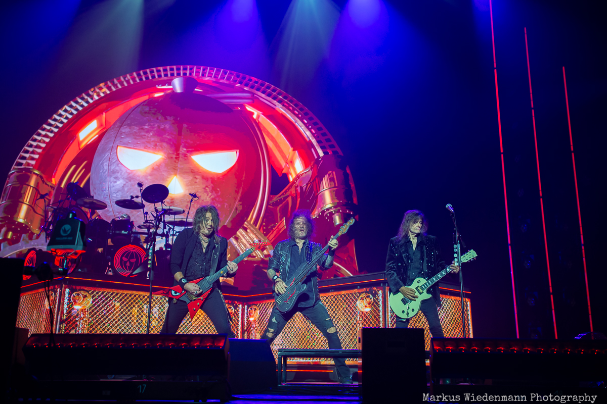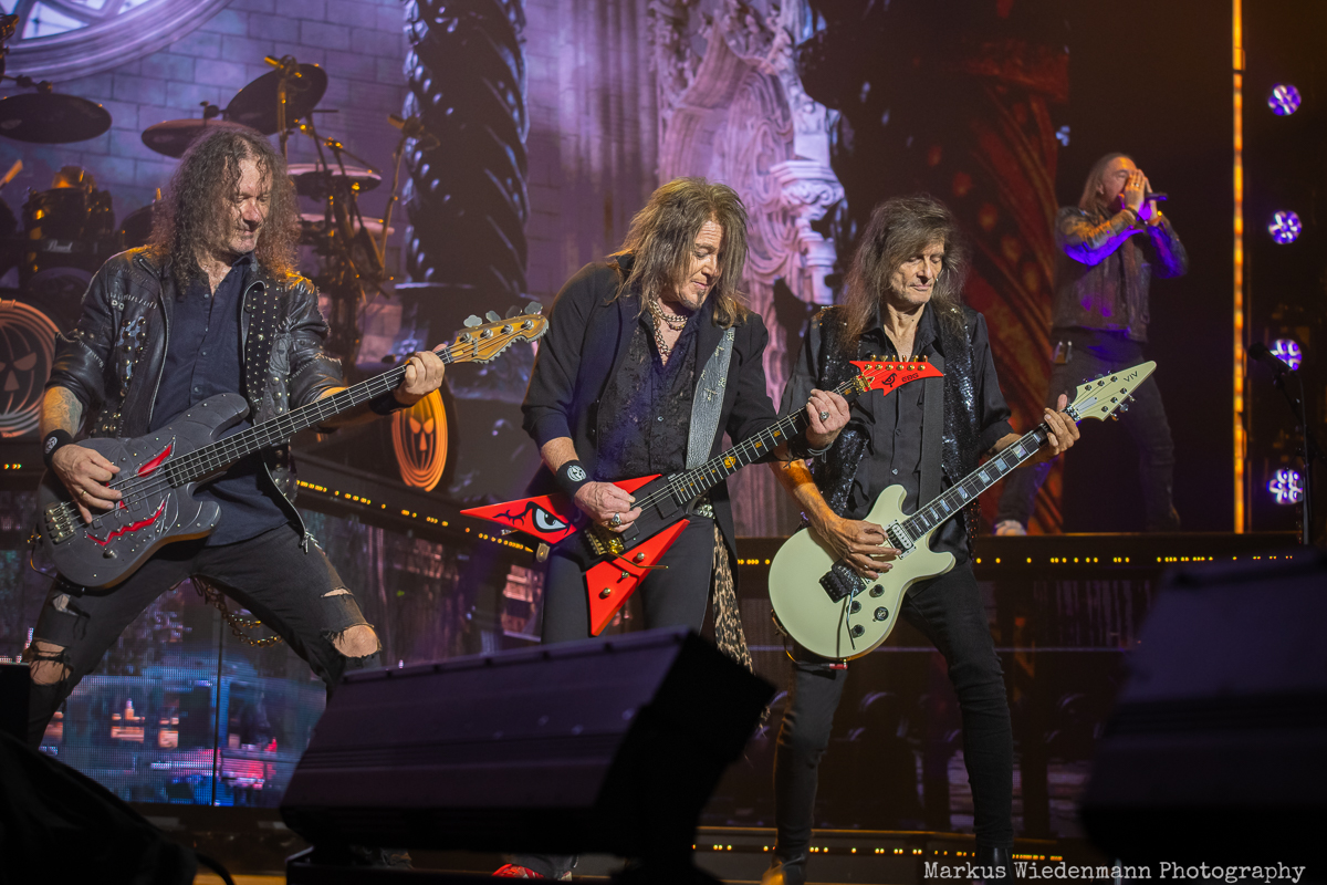 Nevertheless, Helloween put on a great show. The stage is covered with a huge curtain displaying the word ‘Helloween’, just in case anyone is in any doubt as to what is about to happen. Robbie Williams’ “Let Me Entertain You” fills the arena, and the next 2.5 hours are pure entertainment, starting with “March of Time” from the second “Keeper-” album. Starting with such a song is a great choice, and the reaction in the arena shows that we are watching a band with home-field advantage. Helloween is based in Hamburg, and many fans from the greater Hamburg area are present tonight to celebrate 40 years of thrilling heavy metal from Germany’s north, but there are also plenty of fans from outside Hamburg to join the party.