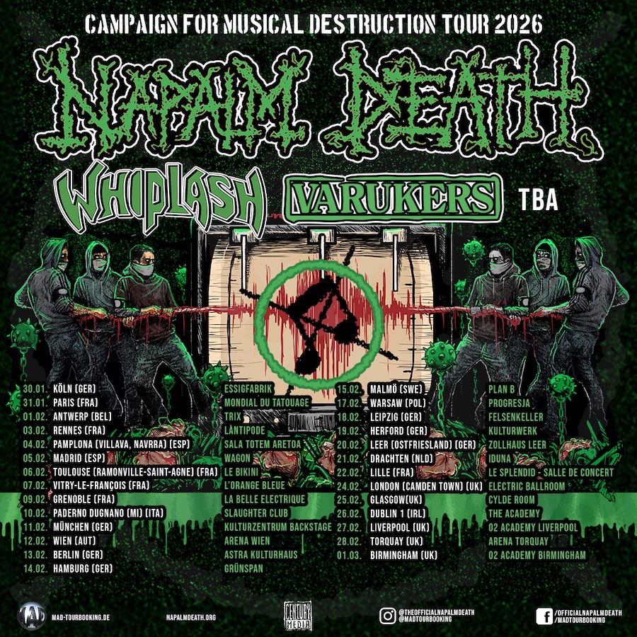 Napalm Death will embark on a European/UK tour in 2026 which includes a show at Gruenspan, Hamburg on February 14th, 2026. With them on tour will be Whiplash and Varukers plus one band to be announced.