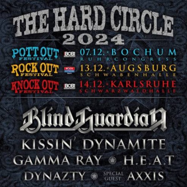 The Hard Circle 2024 includes three festivals with the same line-up, starting on December 7th, 2024 in Bochum. Saturday, 7.12.2024 Pott Out Festival - Bochum/ Ruhrcongress Friday, 13.12.2024 Rock Out Festival - Augsburg/ Schwabenhalle Saturday, 14.12. 2024 Knock Out Festival - Karlsruhe/ Schwarzwaldhalle (SOLD OUT) And these are the bands: Blind Guardian Kissin’ Dynamite Gamma Ray H.E.A.T Dynazty Axxis