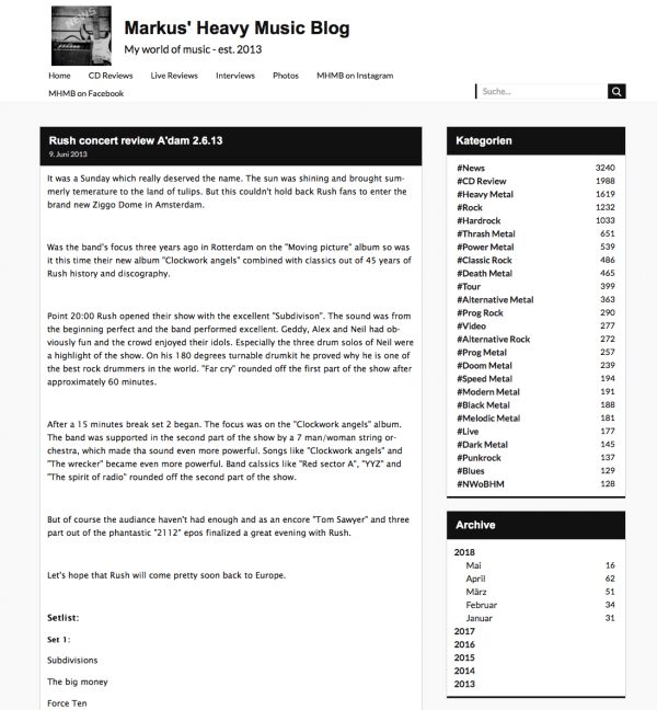 Five years ago the first post went online for Markus' Heavy Music Blog. It was a live report of a Rush concert the Canadians played in Amsterdam. Many more posts followed and it's a good moment to also say THANK YOU to everybody who reads stuff on my blog as well as to everybody that... Continue Reading →