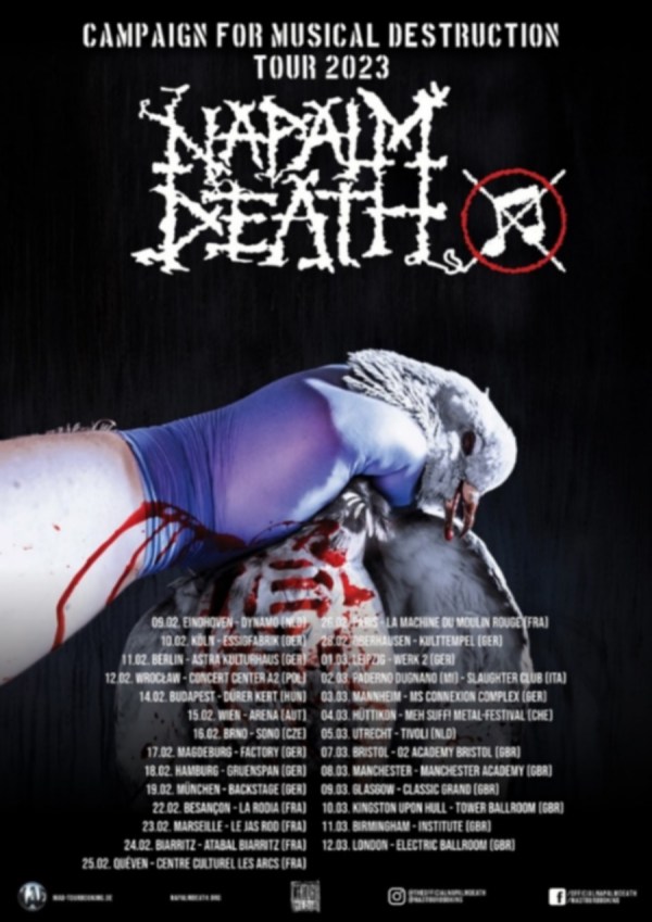 Grindcore specialists Napalm Death will be on tour. 'Campaign for Musical Destruction' is the name of the tour that brings the band to many European cities in early 2023. Thu 09.02.2023 Eindhoven (The Netherlands) - Dynamo Fri 10.02.2023 Köln (Germany) - Essigfabrik Sat 11.02.2023 Berlin (Germany) - Astra Kulturhaus Sun 12.02.2023 Wrocław (Poland) - Concert... Continue Reading →
